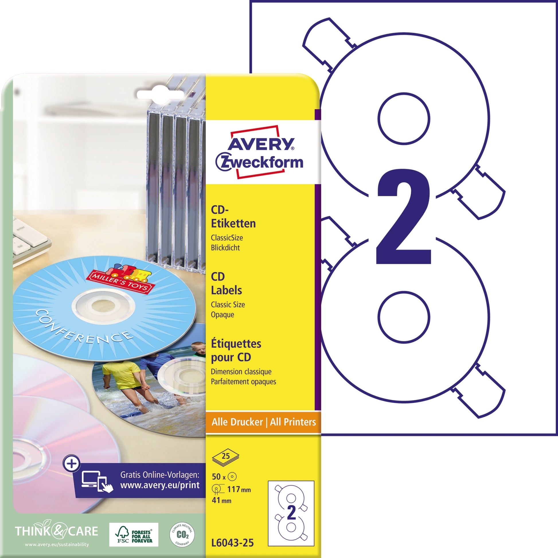 Sie können sich auf einen absolut staufreien Druckerdurchlauf ohne Klebstoffablagerungen im Drucker und ein gestochen scharfes Druckbild ohne Verwischen verlassen. Die CD-Etiketten bedecken die Fläche der CD, aber nicht die durchsichtige Mitte, die CD-Aufkleber sind außerdem mit praktischen Haltelaschen ausgestattet, die ein einfaches und mittiges Aufbringen ermöglichen. Ideen drucken - einfach & professionell: mit Etiketten von Avery Zweckform können Sie den kostenlosen Online Etiketten-Designer unter www.avery.eu/print nutzen. Gestalten Sie Ihr Etikett mit der Software komplett selbst, verwenden Sie eine der Design-Vorlagen zu zahlreichen Themen, die Sie individuell anpassen können oder laden Sie Ihr fertiges Design hoch und drucken anschließend standgenau aus. So schnell und einfach sorgen Sie für einen professionellen Auftritt.
