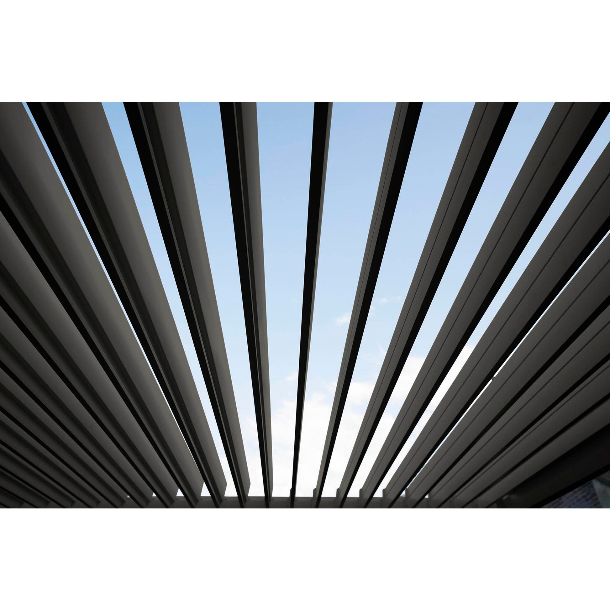 Die gesamte Konstruktion besteht aus einem stabilen Gestell. Das verstellbare Lamellendach mit 17 cm breiten Lamellen reguliert die Luftzirkulation und den Sonneneinfall. In geschlossener Position ist das Dach regensicher, und das Wasser wird über die Regenablaufrinne abgeführt. Die Lamellen sind mit einer Handkurbel individuell und einfach verstellbar. Die 11 x 11 cm starken Pfosten mit innenliegender Profilkante und Sockel zur Bodenverankerung sind besonders standfest. Die umlaufende Dachzarge ist dank Eckverbindern stark dimensioniert, stabil und verwindungssicher.