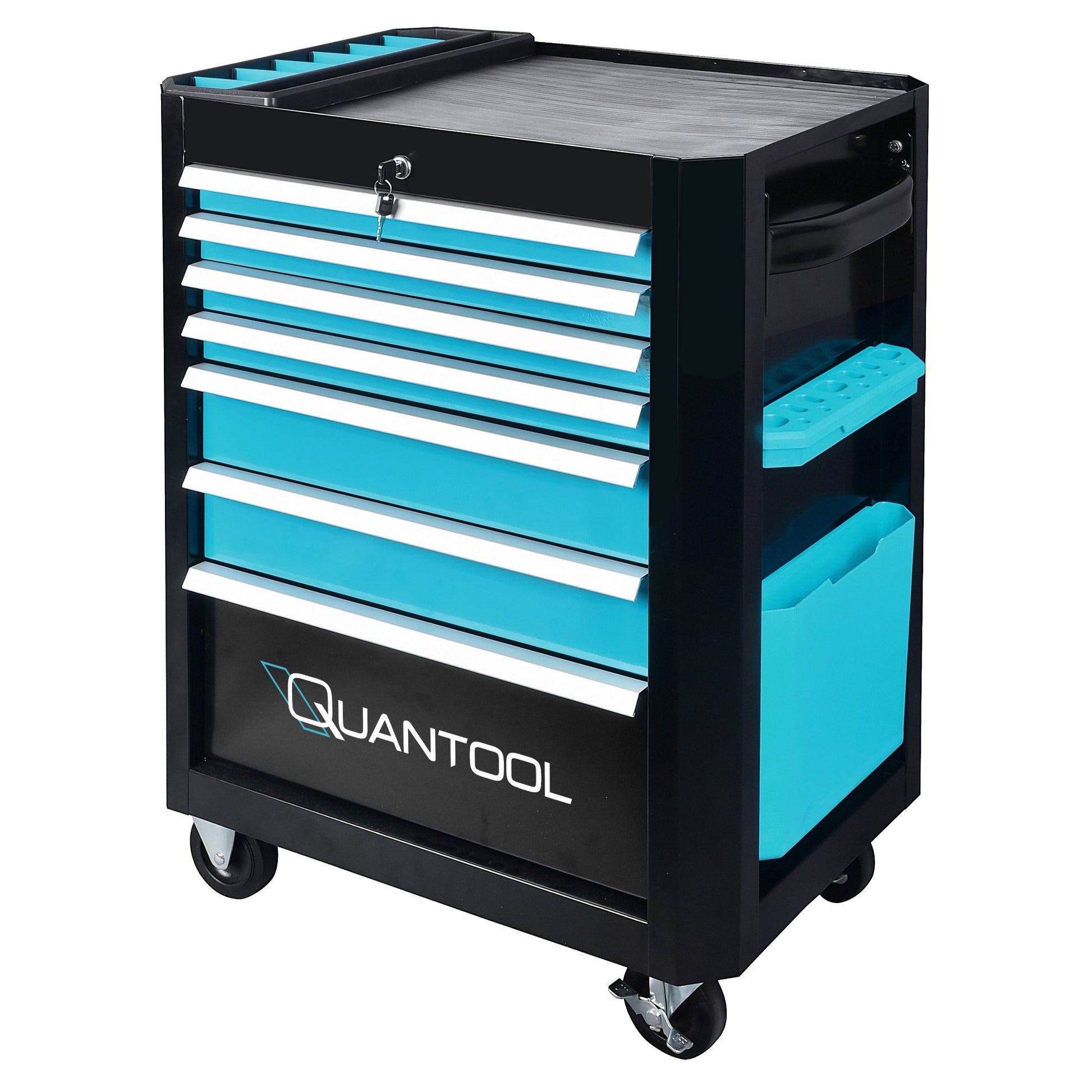 Erleben Sie die Zukunft der Werkstattorganisation mit dem Quantool Werkstattwagen Q25160 - der ultimativen Lösung für professionelle Handwerker und DIY-Enthusiasten! Ein gut organisierter Arbeitsplatz ist der Schlüssel zu Effizienz und Produktivität, und der Quantool Werkstattwagen Q25160 ist Ihr Ticket zu einem geordneten und effektiven Arbeitsbereich. Dieser hochwertige Werkstattwagen bietet Ihnen eine Kombination aus Funktionalität, Stabilität und Stil, die in keiner Werkstatt fehlen sollte. Mit seinen großzügigen Abmessungen und der robusten Stahlkonstruktion kann der Q25160 Werkstattwagen problemlos schwere Werkzeuge und Ausrüstungen aufnehmen. Der Werkstattwagen verfügt über geräumige Schubladen, die mit kugelgelagerten Gleitschienen für reibungsloses Öffnen und Schließen ausgestattet sind. Diese Schubladen bieten ausreichend Platz für Werkzeuge aller Art, von Handwerkzeugen bis hin zu Elektrowerkzeugen. Darüber hinaus sind vier dieser Schubladen mit 217 hochwertigen Werkzeugen bestückt. Die Oberfläche des Werkstattwagens ist mit einer pulverbeschichteten Schicht versehen, die nicht nur robust und langlebig ist, sondern auch vor Rost schützt. Dies garantiert eine lange Lebensdauer und hält den Werkstattwagen in einem einwandfreien Zustand. Ein weiteres Highlight des Quantool Werkstattwagens ist die integrierte Werkzeugtafel an der Seite. Hier können Sie Ihre am häufigsten verwendeten Werkzeuge griffbereit aufhängen und so Ihre Arbeitszeit verkürzen. Die Werkzeugtafel ist ein praktisches Extra, das die Organisation Ihrer Werkstatt auf das nächste Level hebt. Abgerundet wird dieser Werkstattwagen noch durch ein verstellbares Kleinteilefach, einer praktischen Gummimatte auf der Arbeitsplatte sowie einem beidseitig anbringbaren Dokumentenfach. Egal, ob Sie ein professioneller Mechaniker, Schreiner oder einfach nur ein begeisterter Heimwerker sind - der Quantool Werkstattwagen Q25160 ist Ihr zuverlässiger Begleiter bei all Ihren Projekten. Bestellen Sie noch heute und erleben Sie die Revolution in Sachen Werkstattorganisation! Machen Sie Schluss mit dem Chaos und erhöhen Sie Ihre Produktivität mit diesem erstklassigen Werkstattwagen von Quantool.