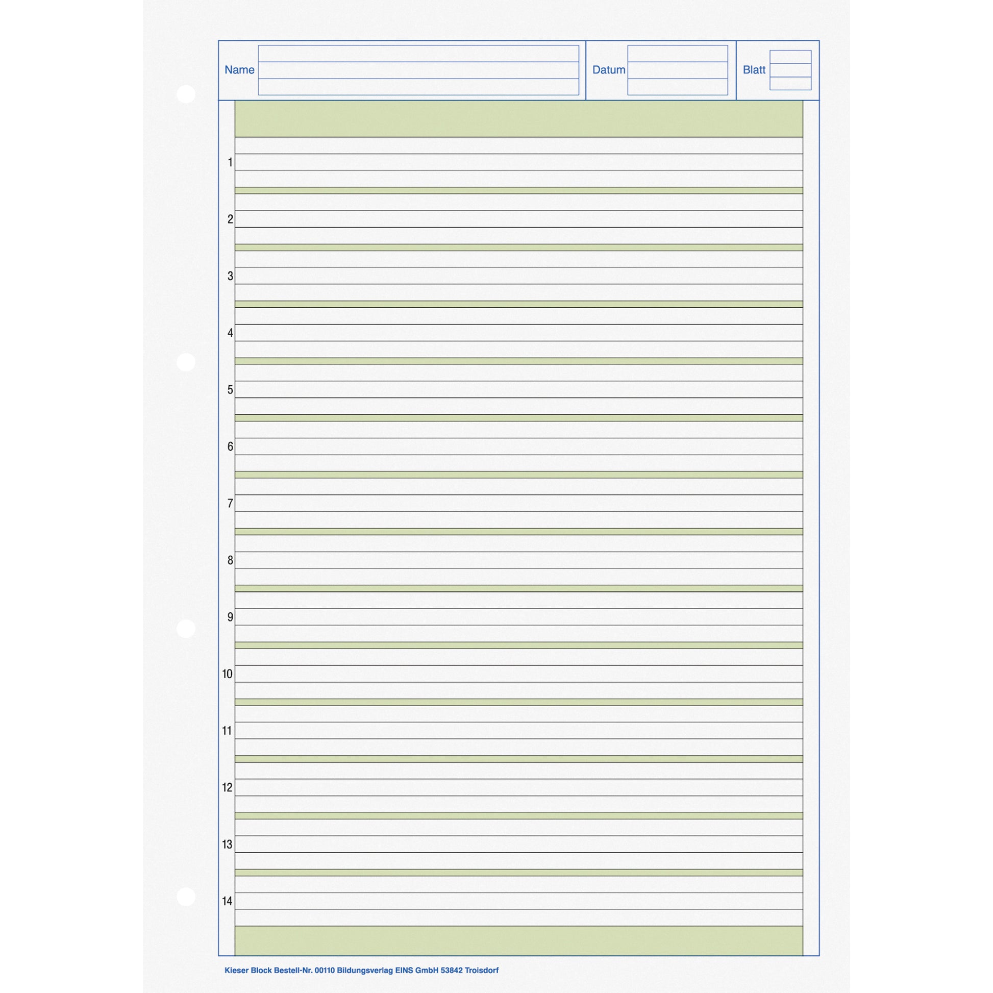 Mit einem Rand, der um das gesamte Blatt verläuft (= Umrandung). Am oberen Rand haben Kieserblöcke einen vorgegebenen Platz für den Namen, das Datum, die Seitenzahl und bei manchen Lineaturen für die Klasse.