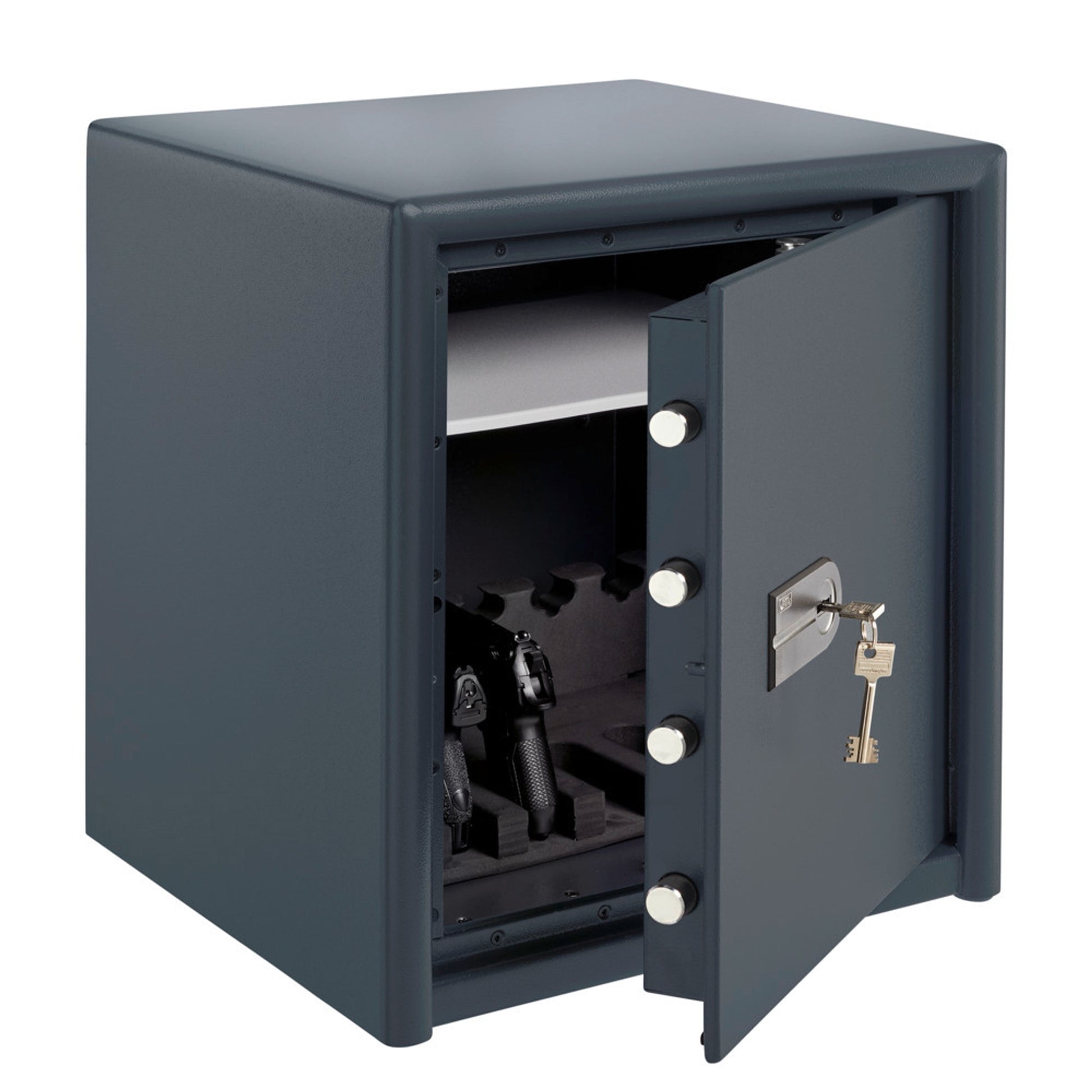 Ob Jäger oder Sportschütze: Waffenbesitzer tragen eine große Verantwortung. Deshalb schreibt § 36 des deutschen Waffengesetzes für die sichere Aufbewahrung von Waffen einen Tresor mit mindestens Widerstandsgrad 0 (N) vor. Diesen Widerstandsgrad bietet unser Magno-Kurzwaffentresor. Das bedeutet, dass bis zu fünf Kurzwaffen mit Munition darin aufbewahrt werden dürfen. Natürlich schützt der Magon Tresor auch Wertsachen und wichtige Dokumente. Das ECB-S-zertifizierte Doppelbart-Sicherheitsschloss "SecuSafe" ist robust und bietet geprüften Schutz. Darüber hinaus sorgt die doppelwandige Konstruktion des Magno für die nötige Sicherheit. Zusätzlich erschweren das innenliegende Scharnier und die Hintergreifschiene an der Scharnierseite Einbruchsversuche. Zudem sorgen kräftige Rundbolzen für eine stabile Verriegelung. Um den Tresor sicher zu fixieren, ist die Rückwandverankerung bereits vorgerichtet.