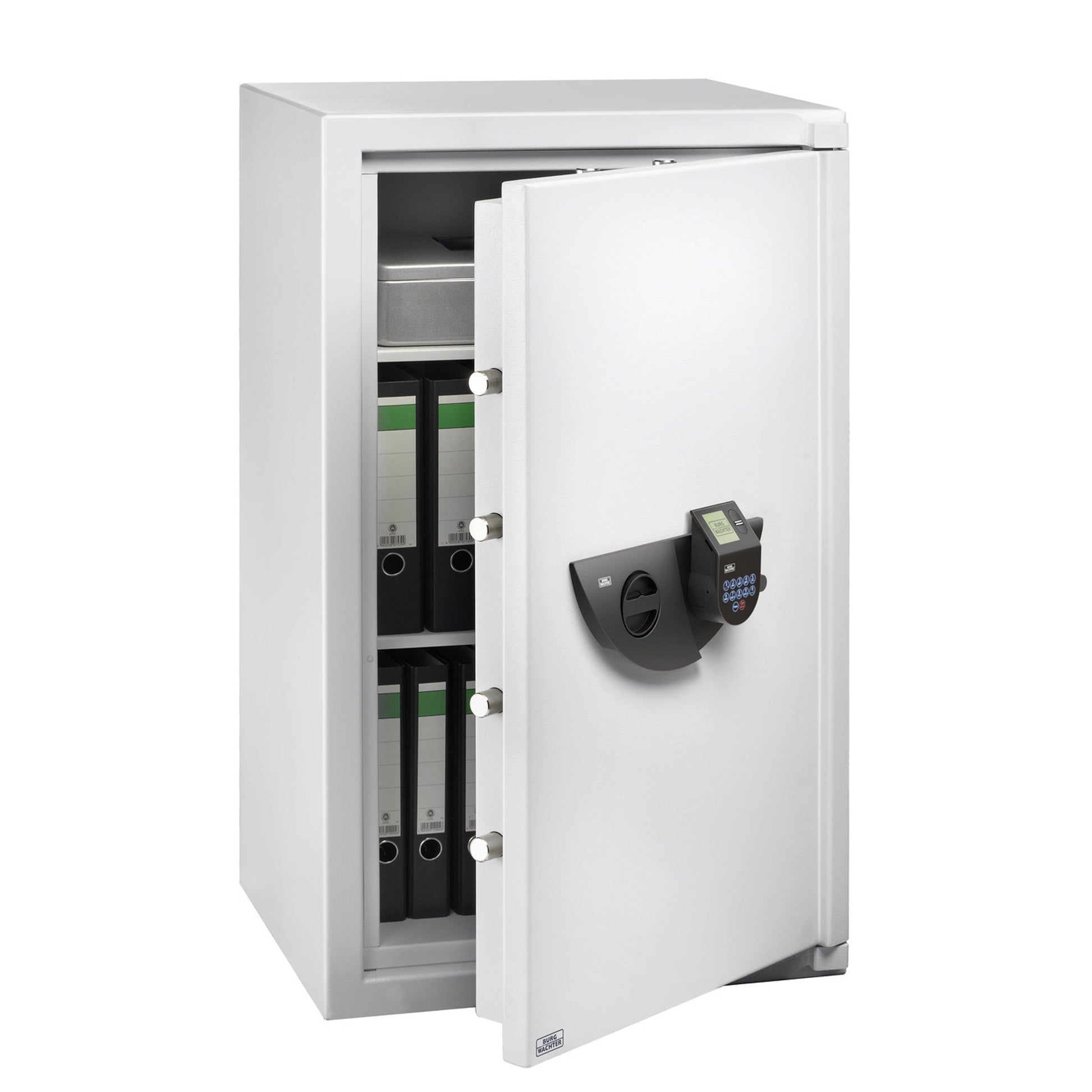 Ob für Firmen, Behörden oder den Privatgebrauch: Der Office-Line OL 804 E FP ist für alle Nutzer ideal geeignet, die wichtige Dokumente oder Wertsachen sicher verschließen wollen. Der Office-Line 804 E FP verfügt über Sicherheitsstufe B und damit über einen robusten Aufbruchschutz. Die stabile, dreiseitige Verriegelung der Tür erfolgt durch starke Rundbolzen und wird zusätzlich durch starre Rundbolzen als Hintergreifriegel an der Bandseite unterstützt. Mit der serienmäßig vorgerichteten Verankerungsmöglichkeit und dem beigefügten Befestigungsmaterial wird der Office-Line 804 E FP fest mit dem Boden verbunden. Die moderne Tresor-Elektronik "SecuTronic“ TRSE 12 V FP des Office-Line 804 E FP bietet ein Touch-Bedienfeld sowie Grafik-Display und kann von bis zu 30 Personen genutzt werden (10 mit Code, 20 mit Fingerprint). Die Tresor-Elektronik (ECB-S zertifiziert) verfügt außerdem über eine individuelle Öffnungsverzögerung (max. 99 Minuten), Lebendfingererkennung "Fake Finger Detection“, Sperrzeiten und ist per Micro-SD-Karte updatefähig. Die Öffnungshistorie ist direkt am Display auslesbar. Dank des schräg gestellten Grafik-Displays haben Nutzer eine optimale Draufsicht, auch von oben. Die Nutzung des Touch-Bedienfelds ist sehr komfortabel, da es bereits nach Berühren des "On“-Feldes aktiviert ist. Durch die zweifarbige Beleuchtung des Bedienfelds ist auch die Benutzung im Dunkeln optimal gewährleistet. Praktisch ist die Ordnertiefe für die Aufbewahrung wichtiger Dokumente. Zwei verstellbare Fachböden tragen zusätzlich zu einer übersichtlichen Organisation bei.