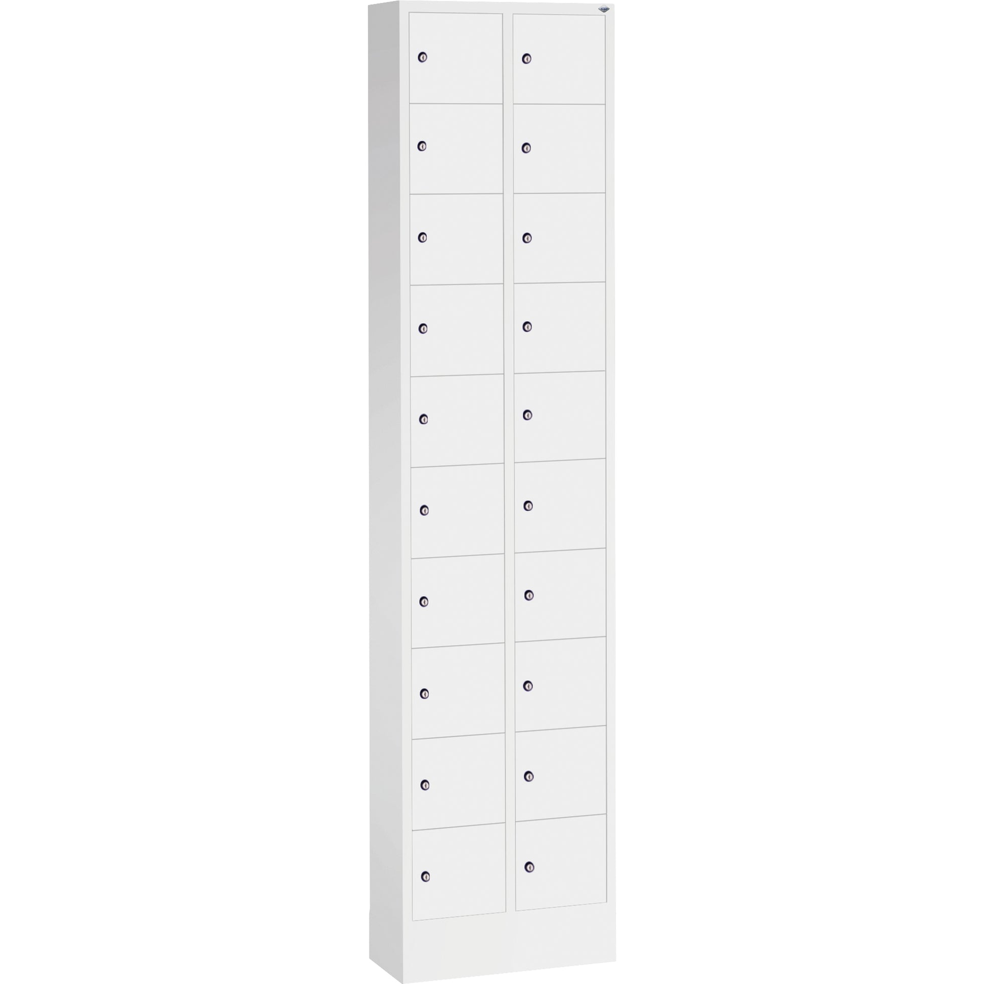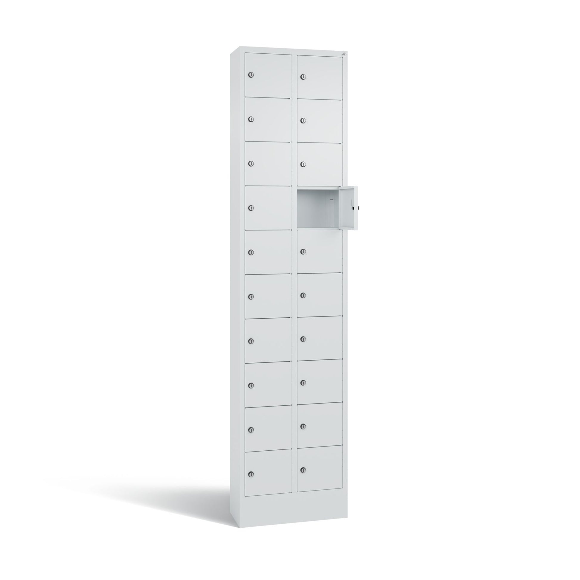 Stahl-Kleingefachschrank Intro. Mit Anschlagsdämpfer, Türaufhängung oben und unten in Drehbolzen, rechts angeschlagen. Auf 100 mm hohem Sockel. Vorgesehen zur Wandbefestigung. Bis 1.000 verschiedene Schließungen. Achtung: Anlieferungsmöglichkeit durch Sattelschlepper muss gegeben sein.