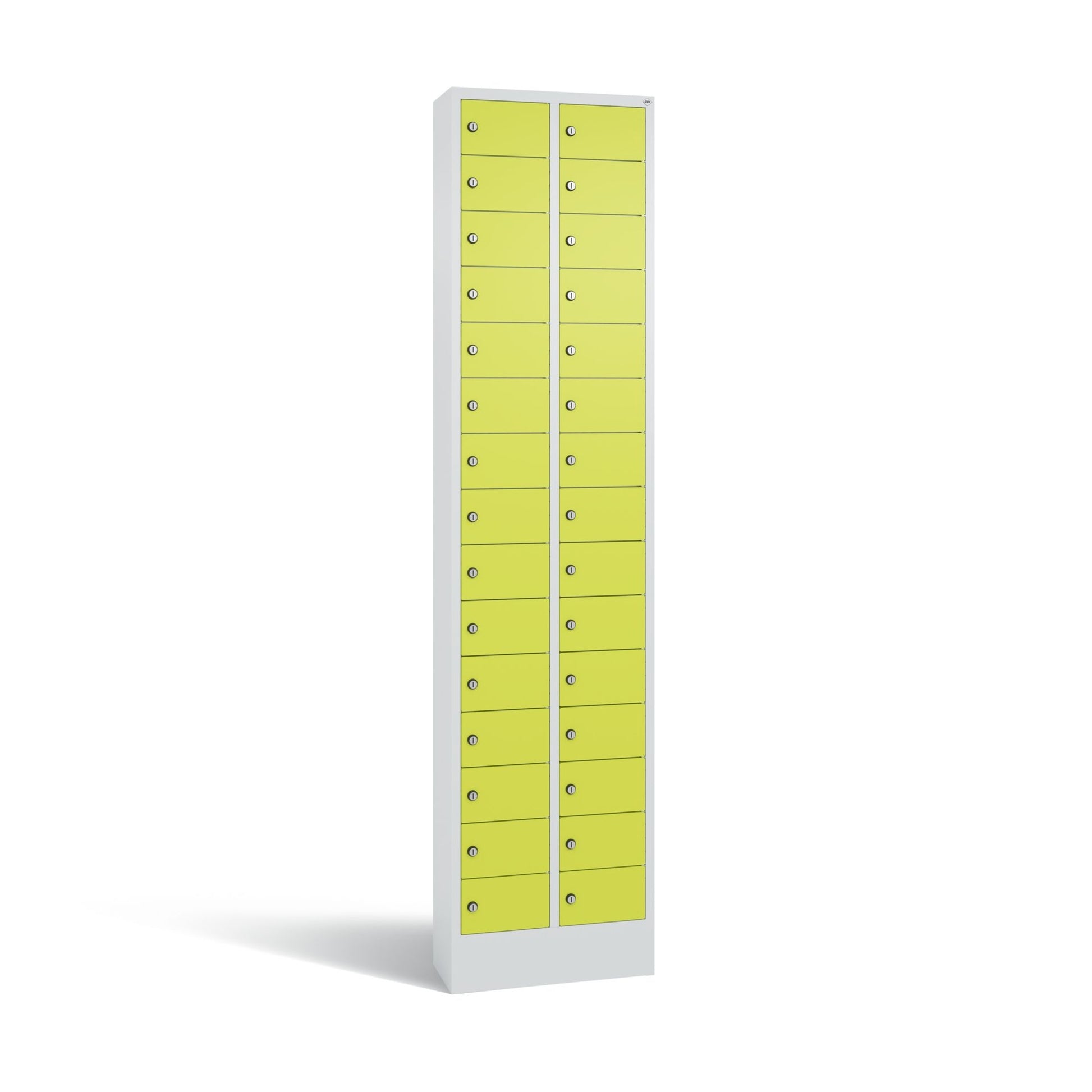 Stahl-Kleingefachschrank Intro. Mit Anschlagsdämpfer, Türaufhängung oben und unten in Drehbolzen, rechts angeschlagen. Auf 100 mm hohem Sockel. Vorgesehen zur Wandbefestigung. Bis 1.000 verschiedene Schließungen. Achtung: Anlieferungsmöglichkeit durch Sattelschlepper muss gegeben sein.