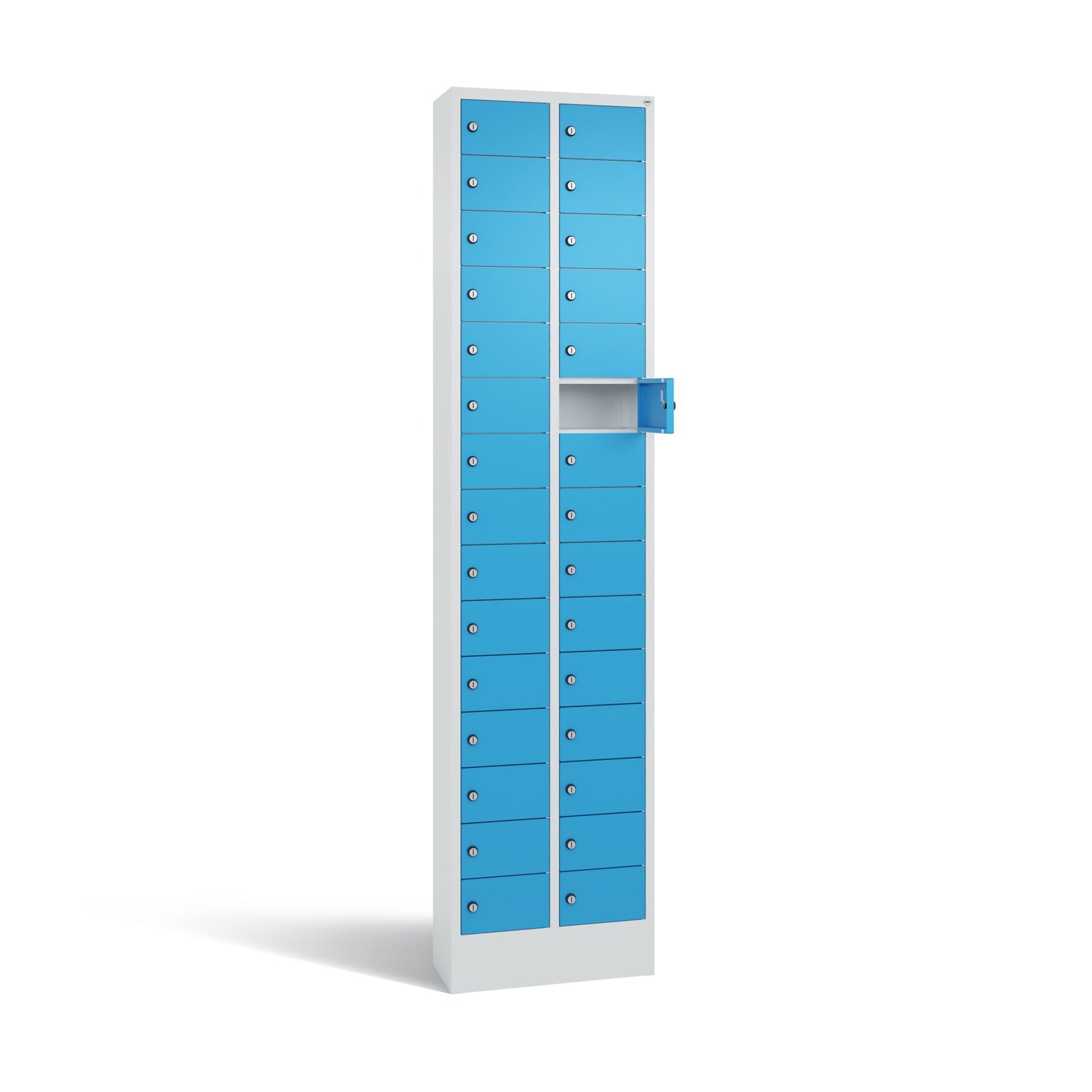 Stahl-Kleingefachschrank Intro. Mit Anschlagsdämpfer, Türaufhängung oben und unten in Drehbolzen, rechts angeschlagen. Auf 100 mm hohem Sockel. Vorgesehen zur Wandbefestigung. Bis 1.000 verschiedene Schließungen. Achtung: Anlieferungsmöglichkeit durch Sattelschlepper muss gegeben sein.