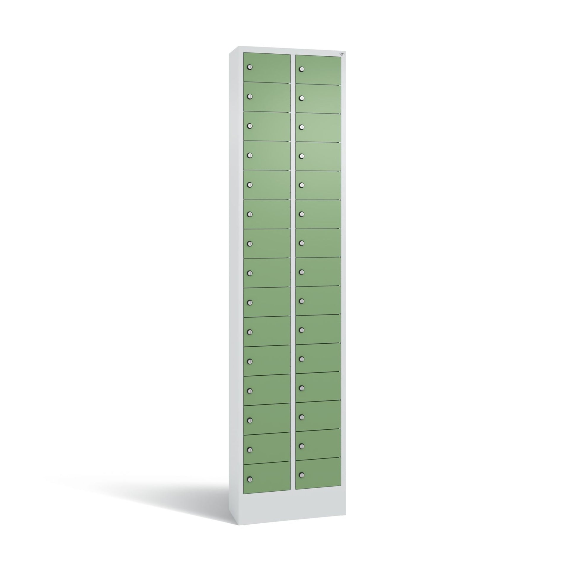 Stahl-Kleingefachschrank Intro. Mit Anschlagsdämpfer, Türaufhängung oben und unten in Drehbolzen, rechts angeschlagen. Auf 100 mm hohem Sockel. Vorgesehen zur Wandbefestigung. Bis 1.000 verschiedene Schließungen. Achtung: Anlieferungsmöglichkeit durch Sattelschlepper muss gegeben sein.