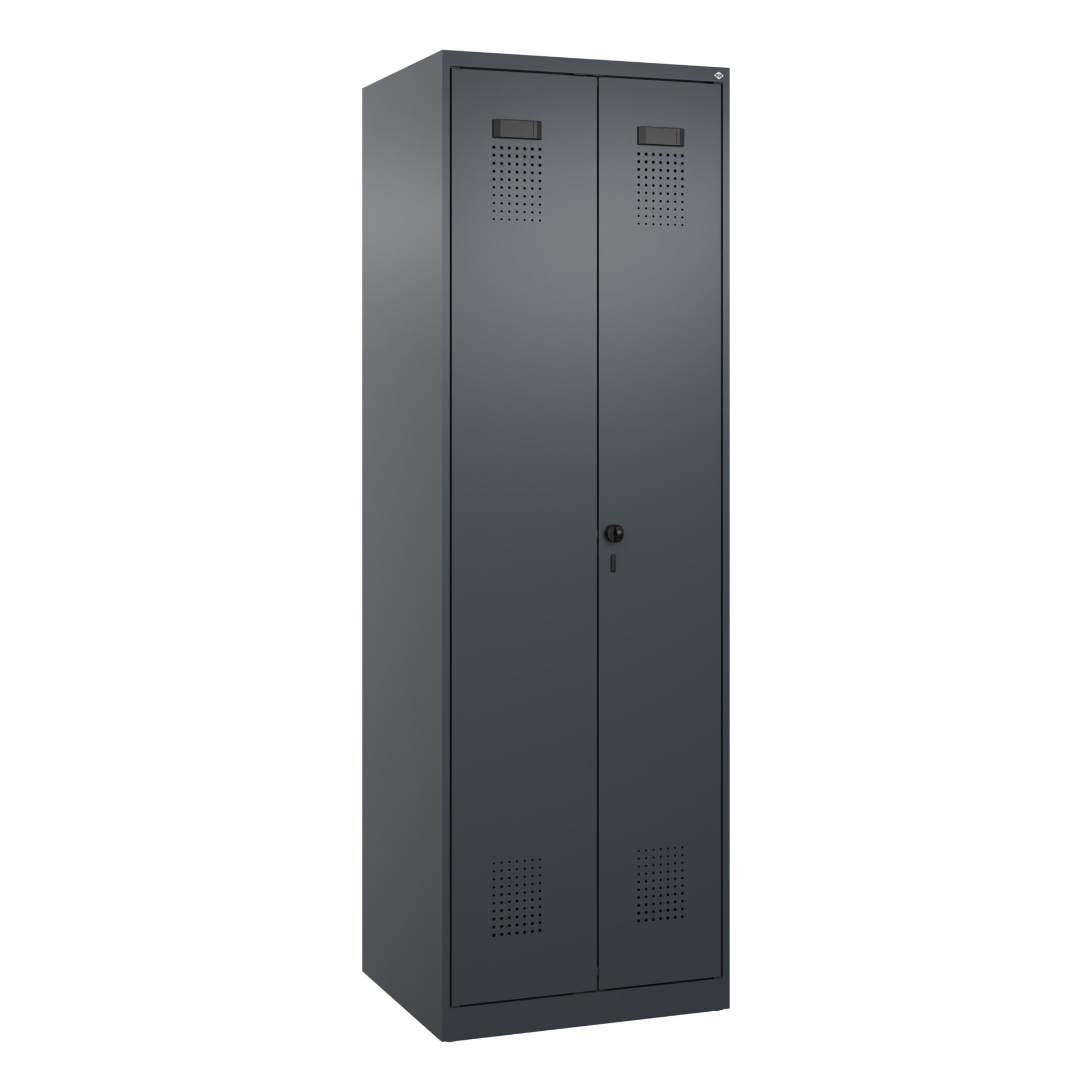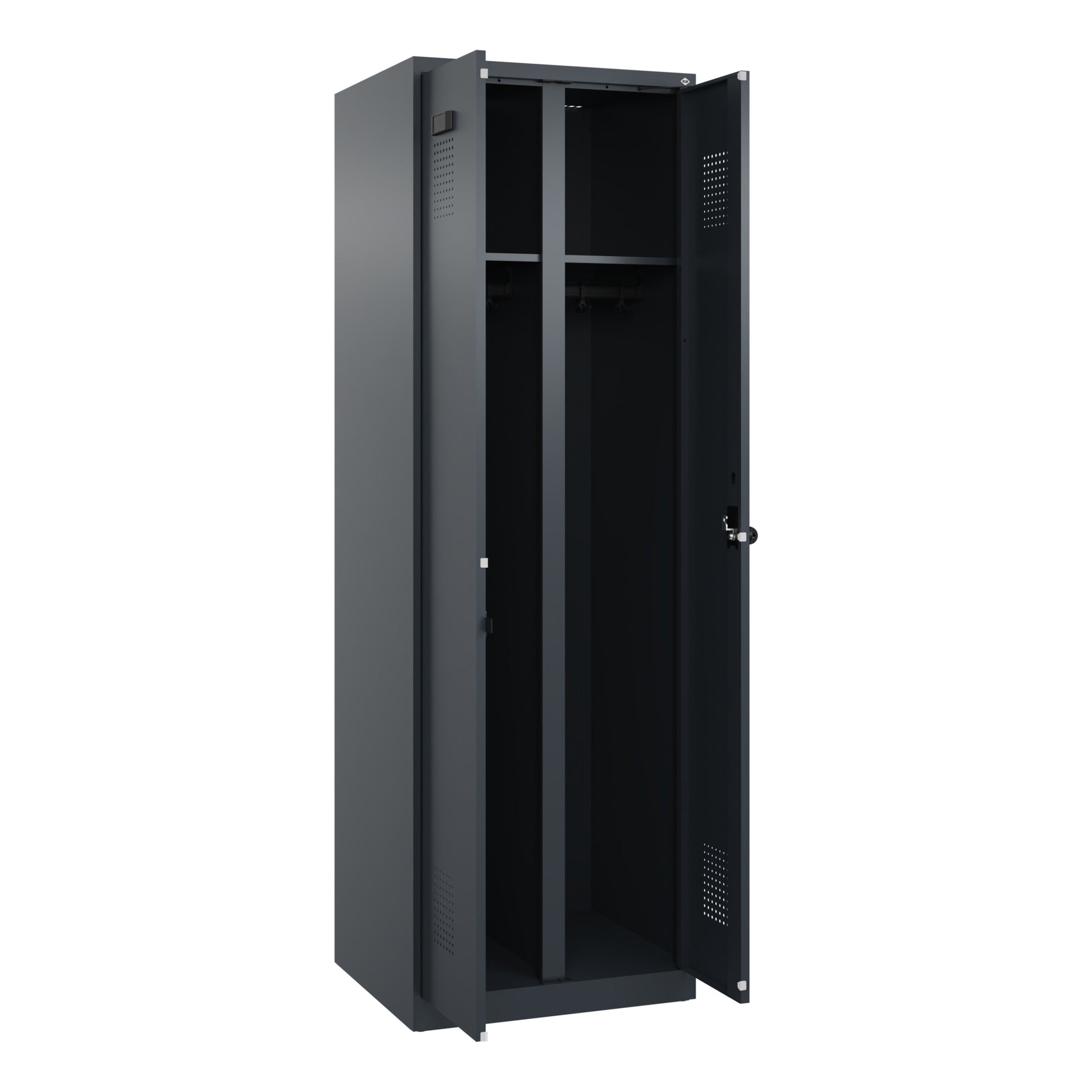 Schwarz-Weiß-Spind Evolo PLUS, 2 Abteile für 1 Person, zur getrennten Unterbringung von Privat- und Berufskleidung. Mit hochwertiger Einbrennbeschichtung für hohe UV- und Korrosionsbeständigkeit, geschlossene und abgeschrägte Seitenprofile für leichte Innenreinigung und komfortable Entnahme von Kleidung und Taschen. Geeignet für verdeckte Kabelführung. Mit hinteren Belüftungsöffnungen oben und unten. Innen je Abteil 1 Ablageboden. Darunter 1 stabile Garderobenstange aus Ovalprofil mit 3 verdrehsicheren Doppel-Schiebehaken inkl. Systemaufnahme. Türen zueinander schlagend für gemeinsamen Verschluss. Türöffnungsbegrenzer als Schutz vor Überdehnen der Tür. Mit Soft-Anschlag und geschlossenen Seitenprofilen für höchste Stabilität. Mit reinigungsfreundlichem Belüftungslochbild oben und unten. Aufhängung in stabilen Drehbolzen. Ergonomische Sicherheits-Drehriegel für Vorhangschloss mit Bügelstärke 6 bis 8 mm, inkl. Tür-Schutz. Kunststoff-Etikettenrahmen, schwarz, selbstklebend, inkl. Klarsichtkunststoff-Abdeckung und weißem Etikett zur individuellen Beschriftung. Achtung: Anlieferungsmöglichkeit durch Sattelschlepper muss gegeben sein.