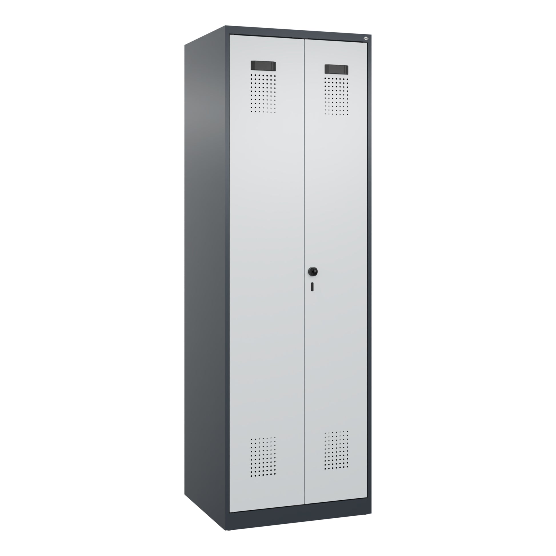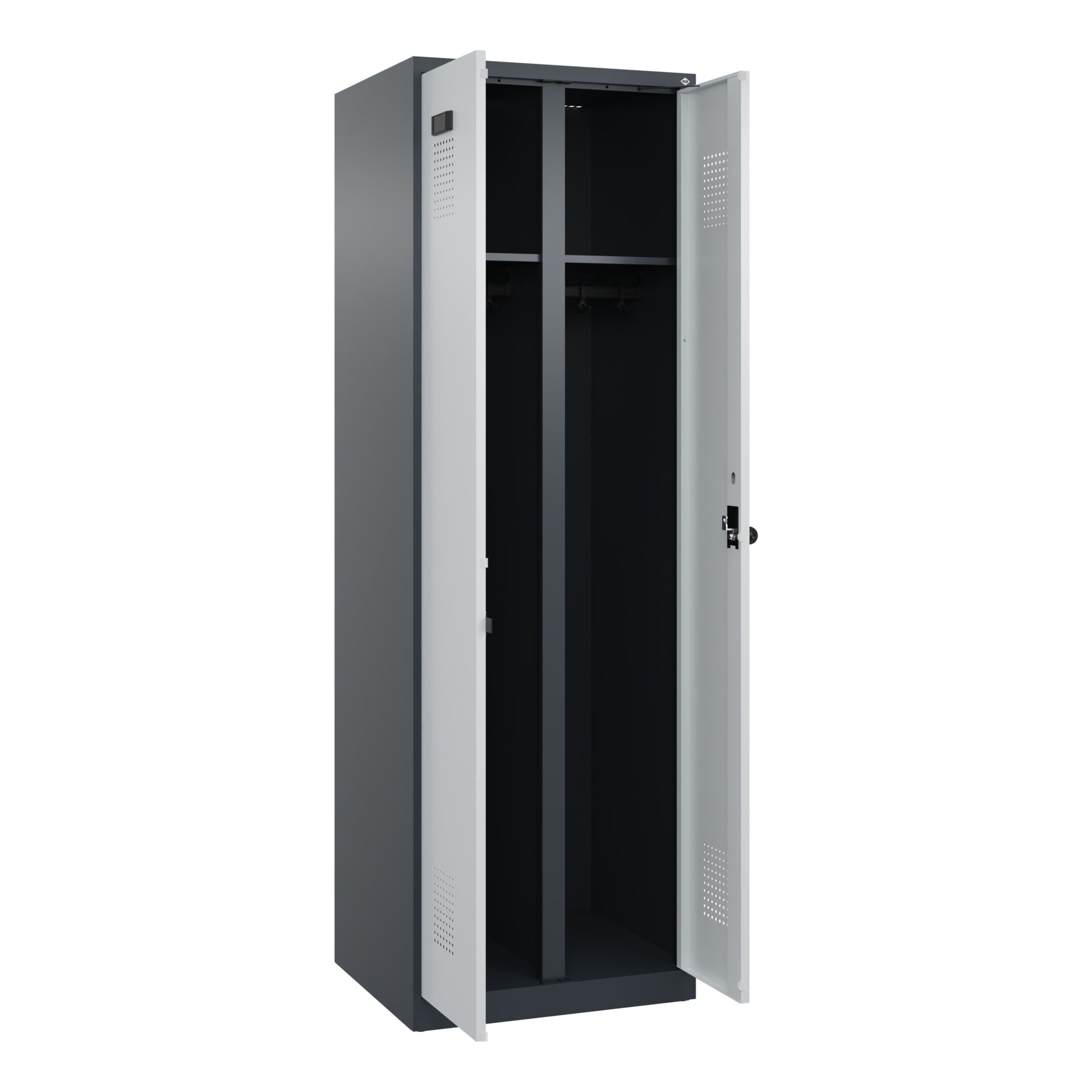 Schwarz-Weiß-Spind Evolo PLUS, 2 Abteile für 1 Person, zur getrennten Unterbringung von Privat- und Berufskleidung. Mit hochwertiger Einbrennbeschichtung für hohe UV- und Korrosionsbeständigkeit, geschlossene und abgeschrägte Seitenprofile für leichte Innenreinigung und komfortable Entnahme von Kleidung und Taschen. Geeignet für verdeckte Kabelführung. Mit hinteren Belüftungsöffnungen oben und unten. Innen je Abteil 1 Ablageboden. Darunter 1 stabile Garderobenstange aus Ovalprofil mit 3 verdrehsicheren Doppel-Schiebehaken inkl. Systemaufnahme. Türen zueinander schlagend für gemeinsamen Verschluss. Türöffnungsbegrenzer als Schutz vor Überdehnen der Tür. Mit Soft-Anschlag und geschlossenen Seitenprofilen für höchste Stabilität. Mit reinigungsfreundlichem Belüftungslochbild oben und unten. Aufhängung in stabilen Drehbolzen. Ergonomische Sicherheits-Drehriegel für Vorhangschloss mit Bügelstärke 6 bis 8 mm, inkl. Tür-Schutz. Kunststoff-Etikettenrahmen, schwarz, selbstklebend, inkl. Klarsichtkunststoff-Abdeckung und weißem Etikett zur individuellen Beschriftung. Achtung: Anlieferungsmöglichkeit durch Sattelschlepper muss gegeben sein.