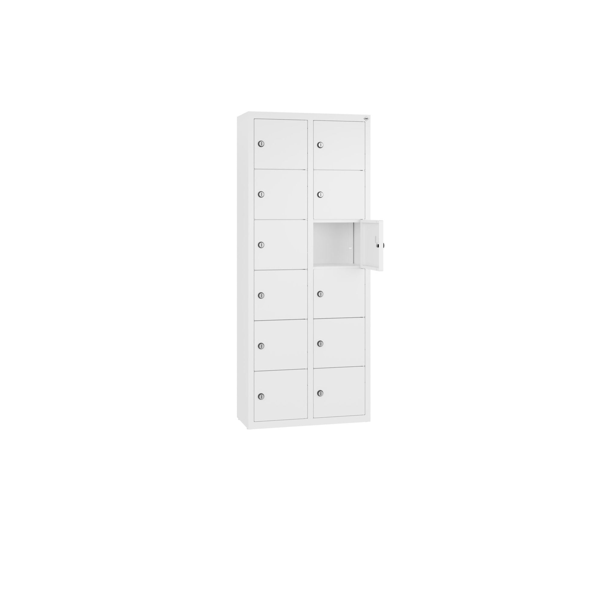 Stahl-Kleingefachschrank Intro wandhängend. Mit Anschlagsdämpfer, Türaufhängung oben und unten in Drehbolzen, rechts angeschlagen. Bis 1.000 verschiedene Schließungen. Achtung: Anlieferungsmöglichkeit durch Sattelschlepper muss gegeben sein.