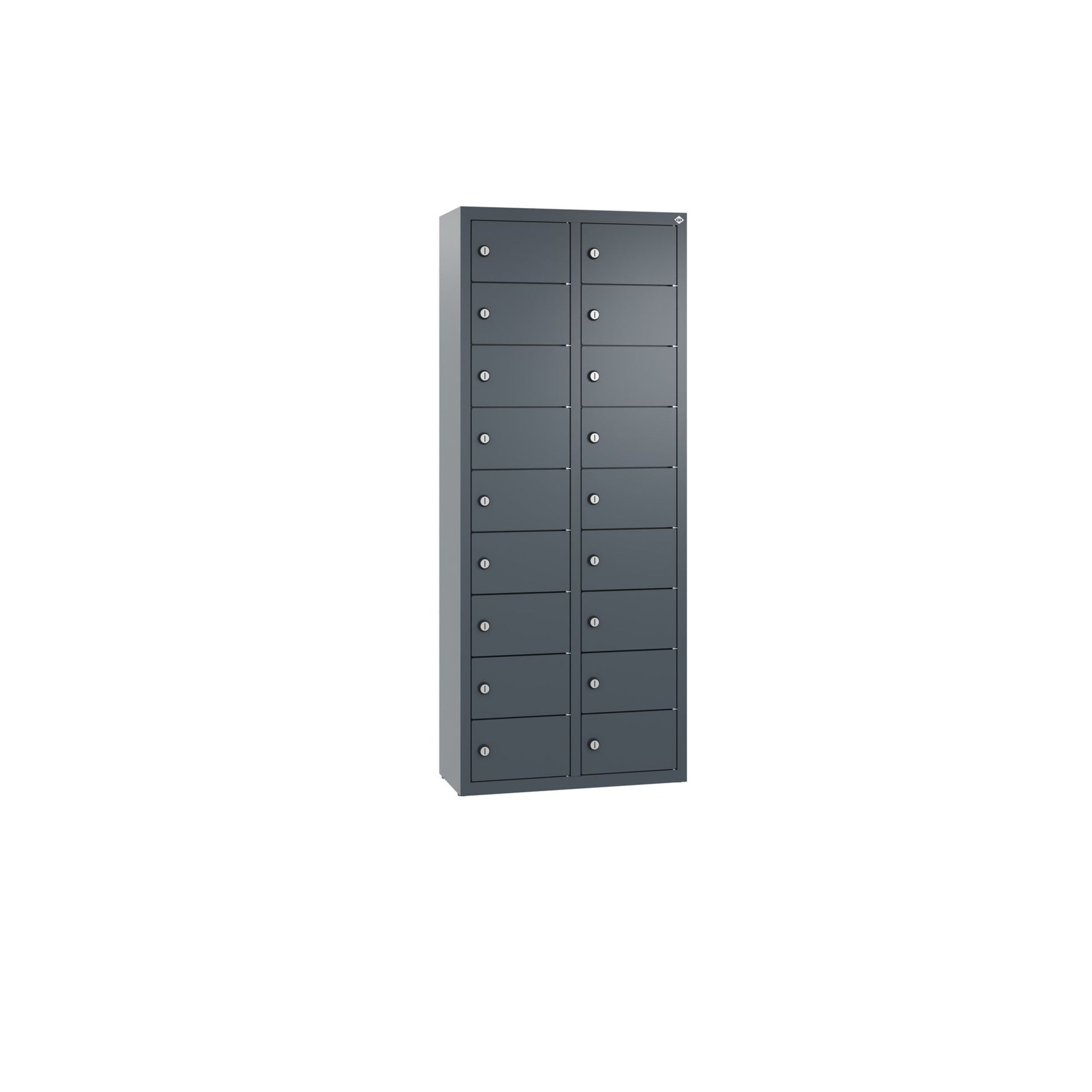 Stahl-Kleingefachschrank Intro wandhängend. Mit Anschlagsdämpfer, Türaufhängung oben und unten in Drehbolzen, rechts angeschlagen. Bis 1.000 verschiedene Schließungen. Achtung: Anlieferungsmöglichkeit durch Sattelschlepper muss gegeben sein.