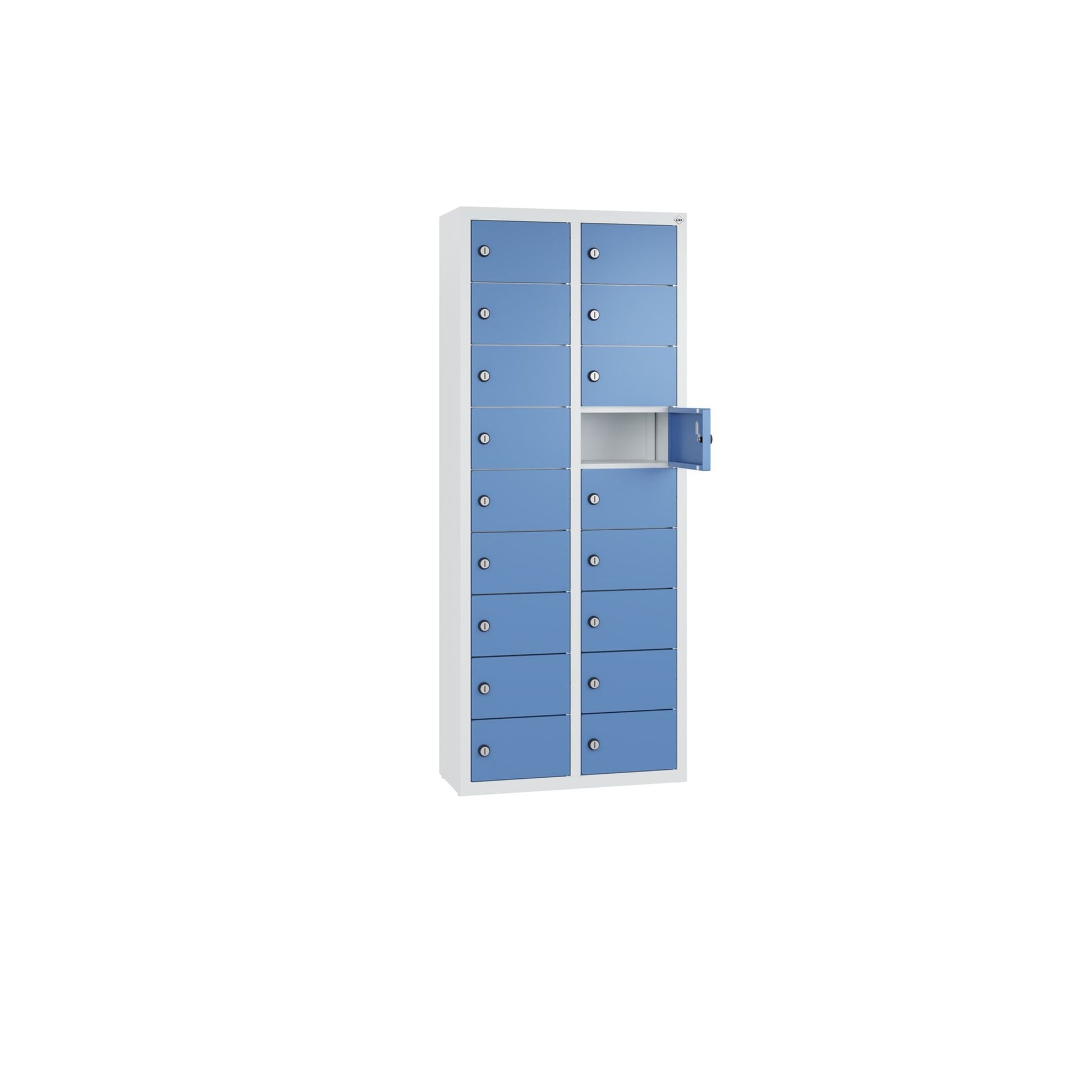 Stahl-Kleingefachschrank Intro wandhängend. Mit Anschlagsdämpfer, Türaufhängung oben und unten in Drehbolzen, rechts angeschlagen. Bis 1.000 verschiedene Schließungen. Achtung: Anlieferungsmöglichkeit durch Sattelschlepper muss gegeben sein.