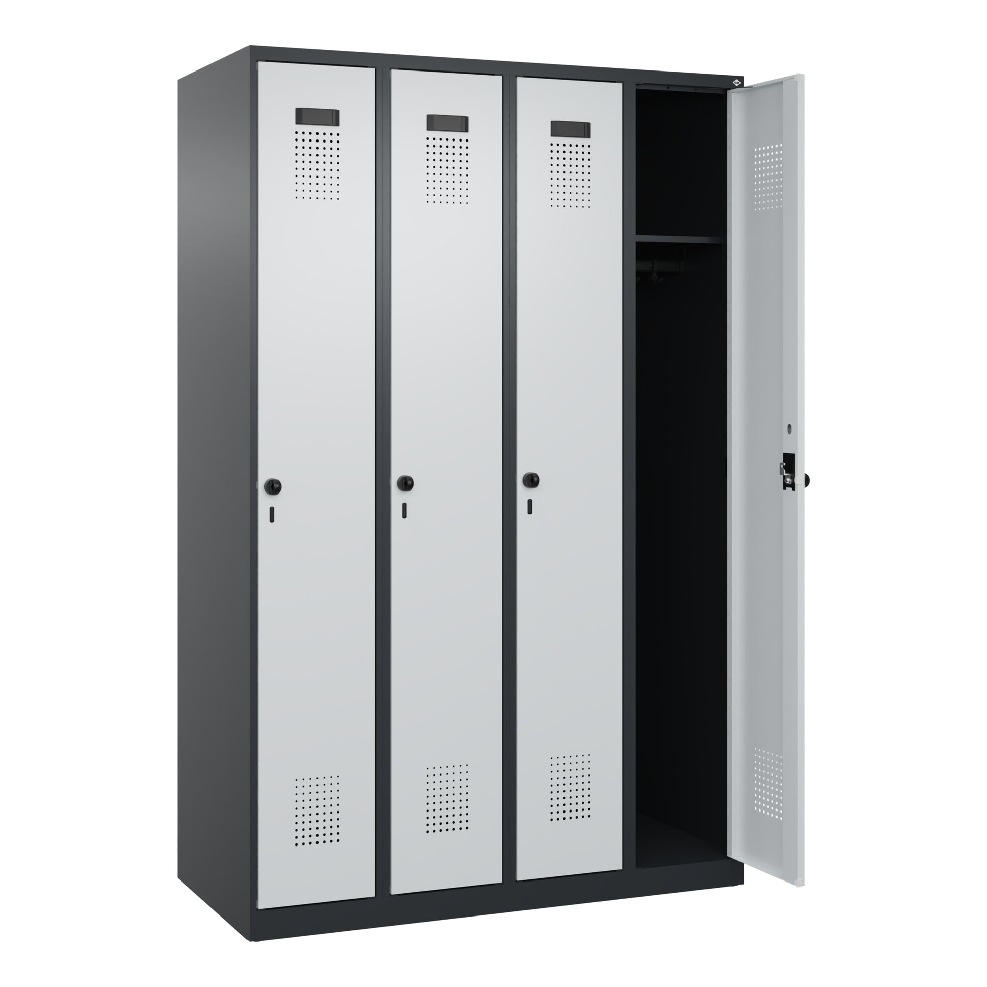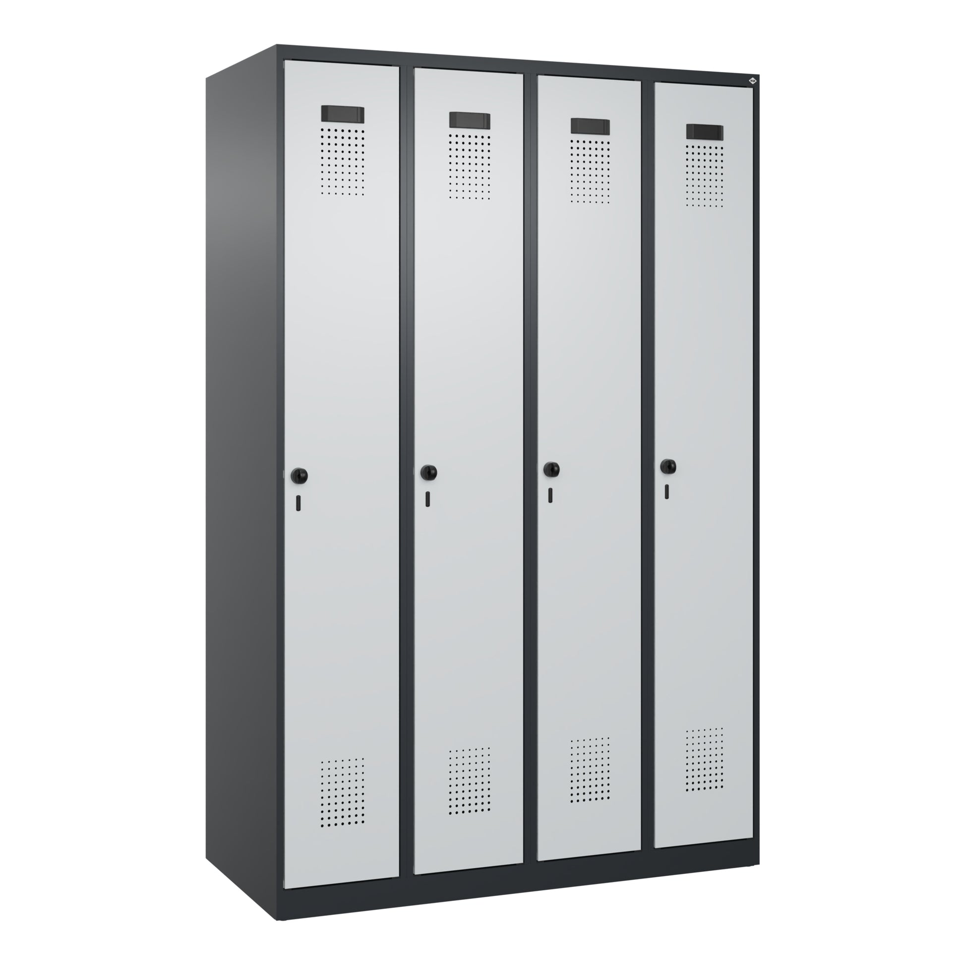 Garderobenschrank Evolo PLUS mit hochwertiger Einbrennbeschichtung für hohe UV- und Korrosionsbeständigkeit. Geschlossene und abgeschrägte Seitenprofile für leichte Innenreinigung und komfortable Entnahme von Kleidung. Türen mit Soft-Anschlag und geschlossenen Seitenprofilen für höchste Stabilität, mit reinigungsfreundlichem Belüftungslochbild oben und unten. Aufhängung in stabilen Drehbolzen. 2 ergonomische Sicherheits-Drehriegel für Vorhangschlösser mit Bügelstärke 6 bis 8 mm. Inkl. Tür-Schutz. Mit schwarzen, selbstklebenden Kunststoff-Etikettenrahmen, inkl. Klarsichtkunststoff-Abdeckung und weißem Etikett zur individuellen Beschriftung. Achtung: Anlieferungsmöglichkeit durch Sattelschlepper muss gegeben sein.