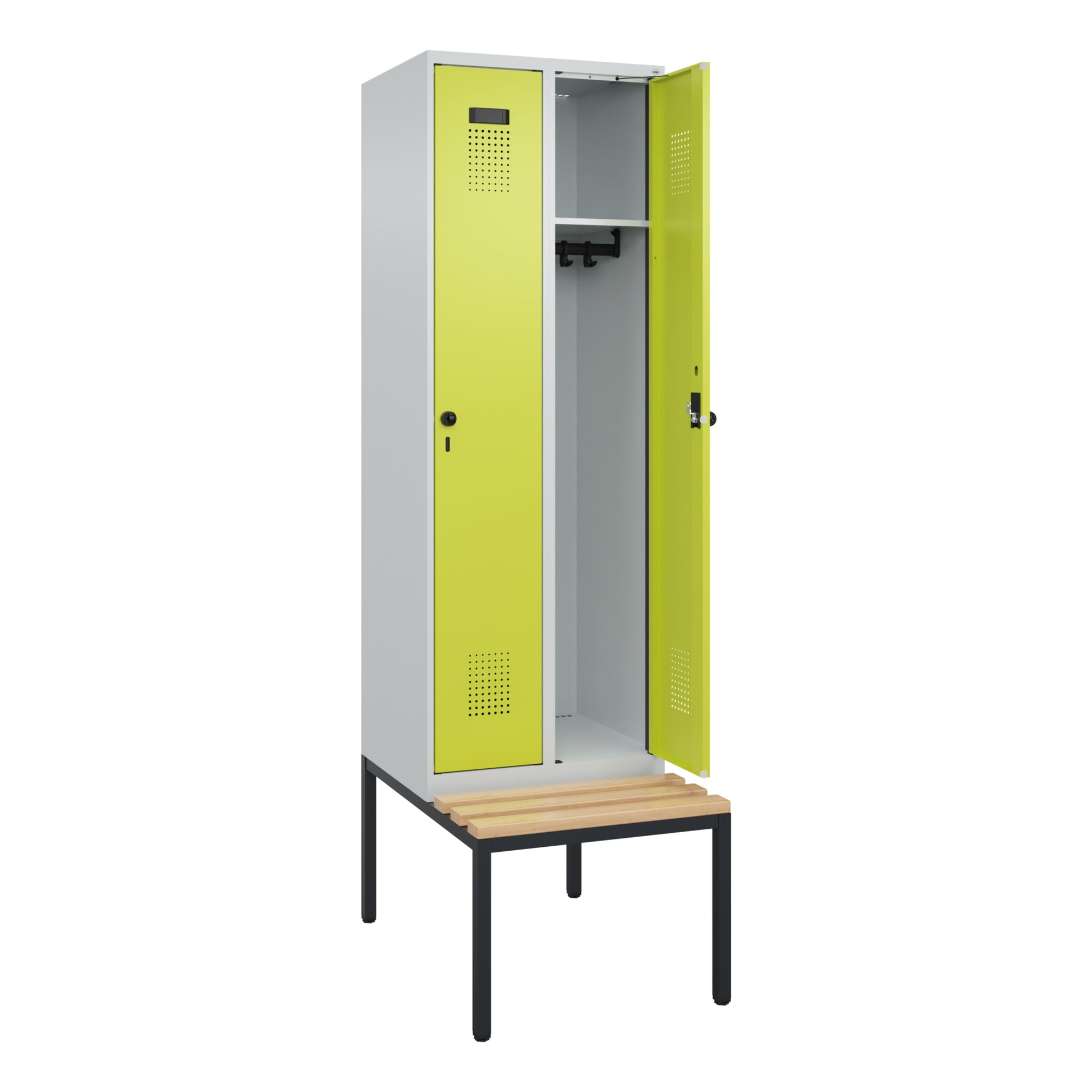 Spind Evolo PLUS mit hochwertiger Einbrennbeschichtung für hohe UV- und Korrosionsbeständigkeit. Geschlossene und abgeschrägte Seitenprofile für leichte Innenreinigung und komfortable Entnahme von Kleidung und Taschen. Geeignet für verdeckte Kabelführung. Mit hinteren Belüftungsöffnungen oben und unten. Innen 1 Ablageboden, darunter 1 stabile Garderobenstange aus Ovalprofil mit 3 verdrehsicheren Doppel-Schiebehaken. Inkl. Systemaufnahme. Sitzbank mit verstellbaren Bodengleitern für einfachen Niveauausgleich. Mit Türöffnungsbegrenzer, als Schutz vor Überdehnen der Tür. Türen rechts angeschlagen. Türen mit Soft-Anschlag und geschlossenen Seitenprofilen für höchste Stabilität. Aufhängung in stabilen Drehbolzen. 4 ergonomische Sicherheits-Drehriegel für Vorhangschlösser mit Bügelstärke 6 bis 8 mm. Mit Kunststoff-Etikettenrahmen, schwarz, selbstklebend, inkl. Klarsichtkunststoff-Abdeckung und weißem Etikett zur individuellen Beschriftung. Achtung: Anlieferungsmöglichkeit durch Sattelschlepper muss gegeben sein.