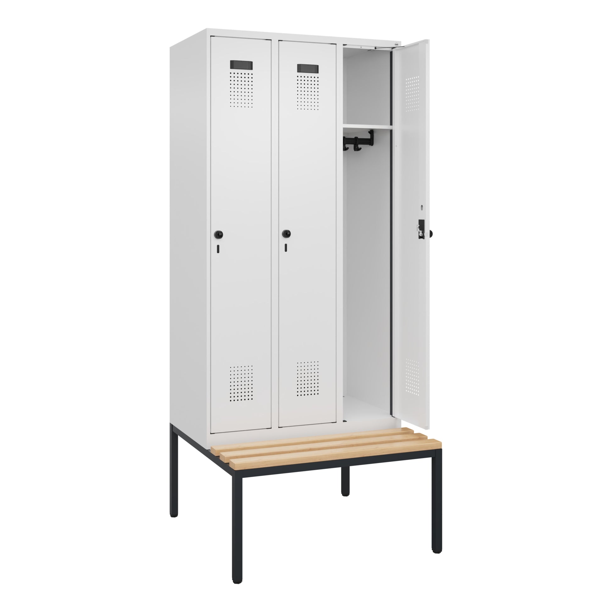Spind Evolo PLUS mit hochwertiger Einbrennbeschichtung für hohe UV- und Korrosionsbeständigkeit. Geschlossene und abgeschrägte Seitenprofile für leichte Innenreinigung und komfortable Entnahme von Kleidung und Taschen. Geeignet für verdeckte Kabelführung. Mit hinteren Belüftungsöffnungen oben und unten. Innen 1 Ablageboden, darunter 1 stabile Garderobenstange aus Ovalprofil mit 3 verdrehsicheren Doppel-Schiebehaken. Inkl. Systemaufnahme. Sitzbank mit verstellbaren Bodengleitern für einfachen Niveauausgleich. Mit Türöffnungsbegrenzer, als Schutz vor Überdehnen der Tür. Türen rechts angeschlagen. Türen mit Soft-Anschlag und geschlossenen Seitenprofilen für höchste Stabilität. Aufhängung in stabilen Drehbolzen. 4 ergonomische Sicherheits-Drehriegel für Vorhangschlösser mit Bügelstärke 6 bis 8 mm. Mit Kunststoff-Etikettenrahmen, schwarz, selbstklebend, inkl. Klarsichtkunststoff-Abdeckung und weißem Etikett zur individuellen Beschriftung. Achtung: Anlieferungsmöglichkeit durch Sattelschlepper muss gegeben sein.