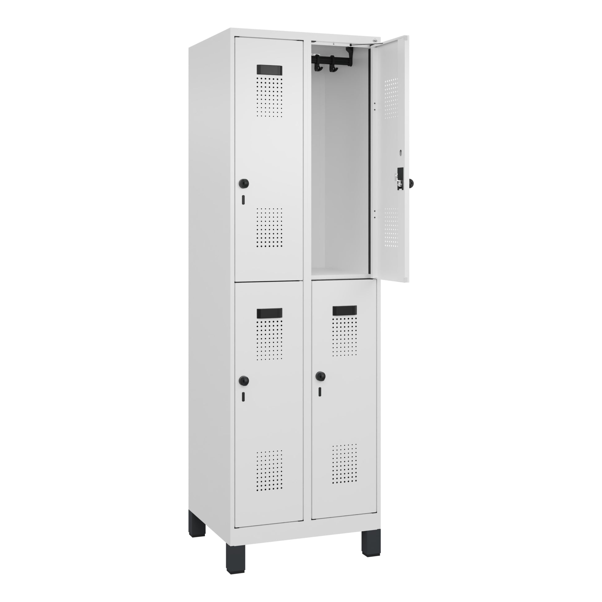 Doppelstöckiger Spind Evolo PLUS mit hochwertiger Einbrennbeschichtung für hohe UV- und Korrosionsbeständigkeit. Geschlossene und abgeschrägte Seitenprofile für leichte Innenreinigung und komfortable Entnahme von Kleidung und Taschen. Geeignet für verdeckte Kabelführung. Mit hinteren Belüftungsöffnungen oben und unten. Innen je Fach 1 stabile Garderobenstange aus Ovalprofil mit 3 verdrehsicheren Doppel-Schiebehaken inkl. Systemaufnahme. Türöffnungsbegrenzer als Schutz vor Überdehnen der Tür. Türen rechts angeschlagen, mit Soft-Anschlag und geschlossenen Seitenprofilen für höchste Stabilität. Aufhängung in stabilen Drehbolzen. Ergonomische Sicherheits-Drehriegel für Vorhangschlösser mit Bügelstärke 6 bis 8 mm. Inkl. Tür-Schutz. Kunststoff-Etikettenrahmen, schwarz, selbstklebend, inkl. Klarsichtkunststoff-Abdeckung und weißem Etikett zur individuellen Beschriftung. Achtung: Anlieferungsmöglichkeit durch Sattelschlepper muss gegeben sein.