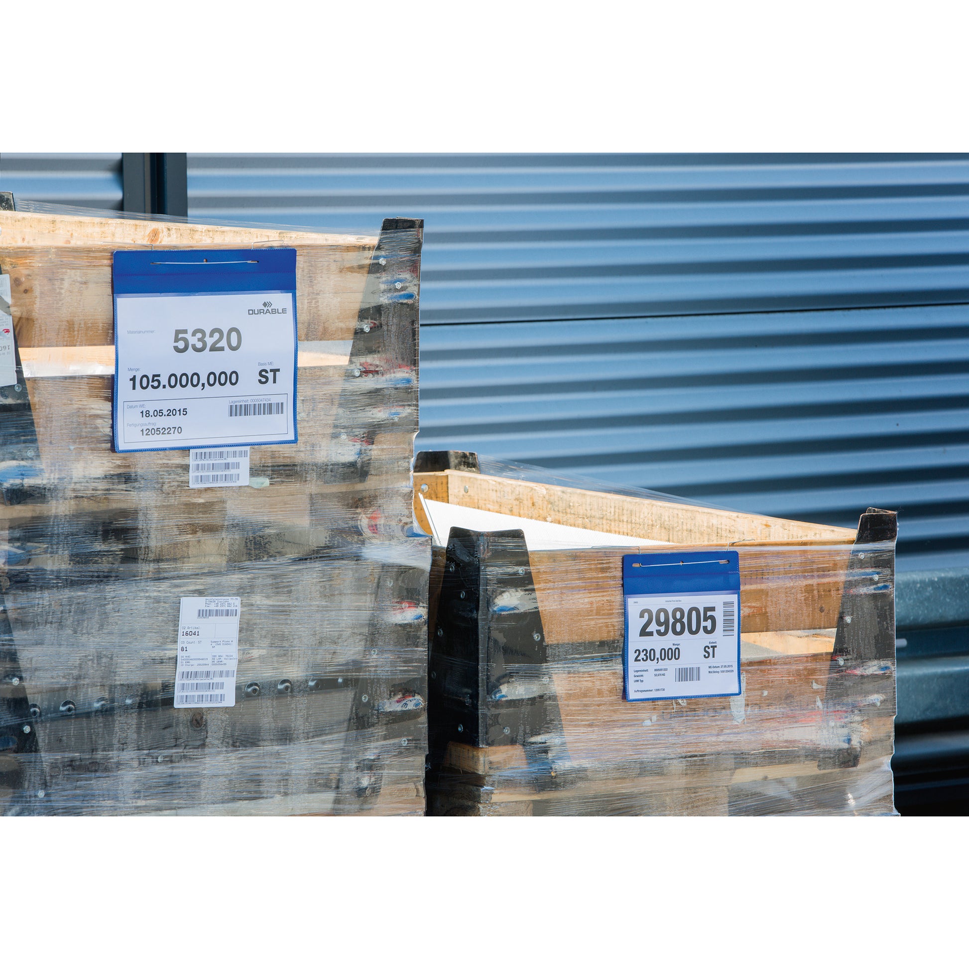 Drahtbügeltasche mit verzinktem, flexiblen Draht zur leichten und sicheren Fixierung. Einsatz an Transportbehältern, Gitterboxen, Holzaufsatzrahmen und Palettenkartons. Schutzklappe schützt Dokumente vor Staub und Feuchtigkeit.