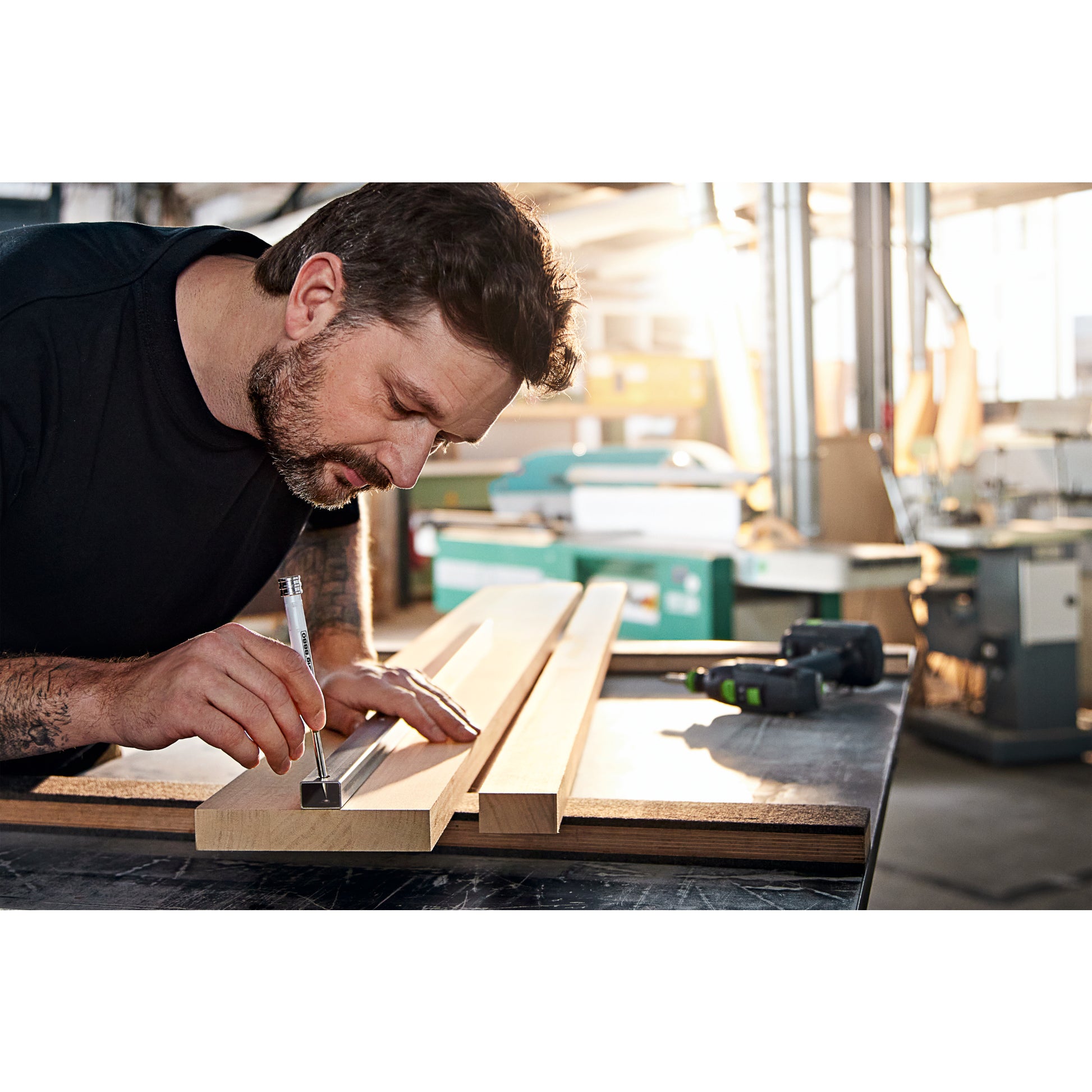 Tieflochmarker im praktischen Holster zum präzisen Markieren auf fast allen Materialien. Durch das lange (42 mm) und dünne (5,5 mm) Mundstück eignet sich der Bleistift gut für enge oder andere schwer zugängliche Stellen, z. B. Bohrlöcher oder Schnittkanten. Schützendes Holster mit praktischem Clip zur einfachen Befestigung des Bleistifts an der (Arbeits-) Kleidung, für den griffbereiten Einsatz des Stifts. Die Mine wird durch den Druckmechanismus automatisch vorgeschoben. Sechseckform des Schaftes verhindert ein Wegrollen.