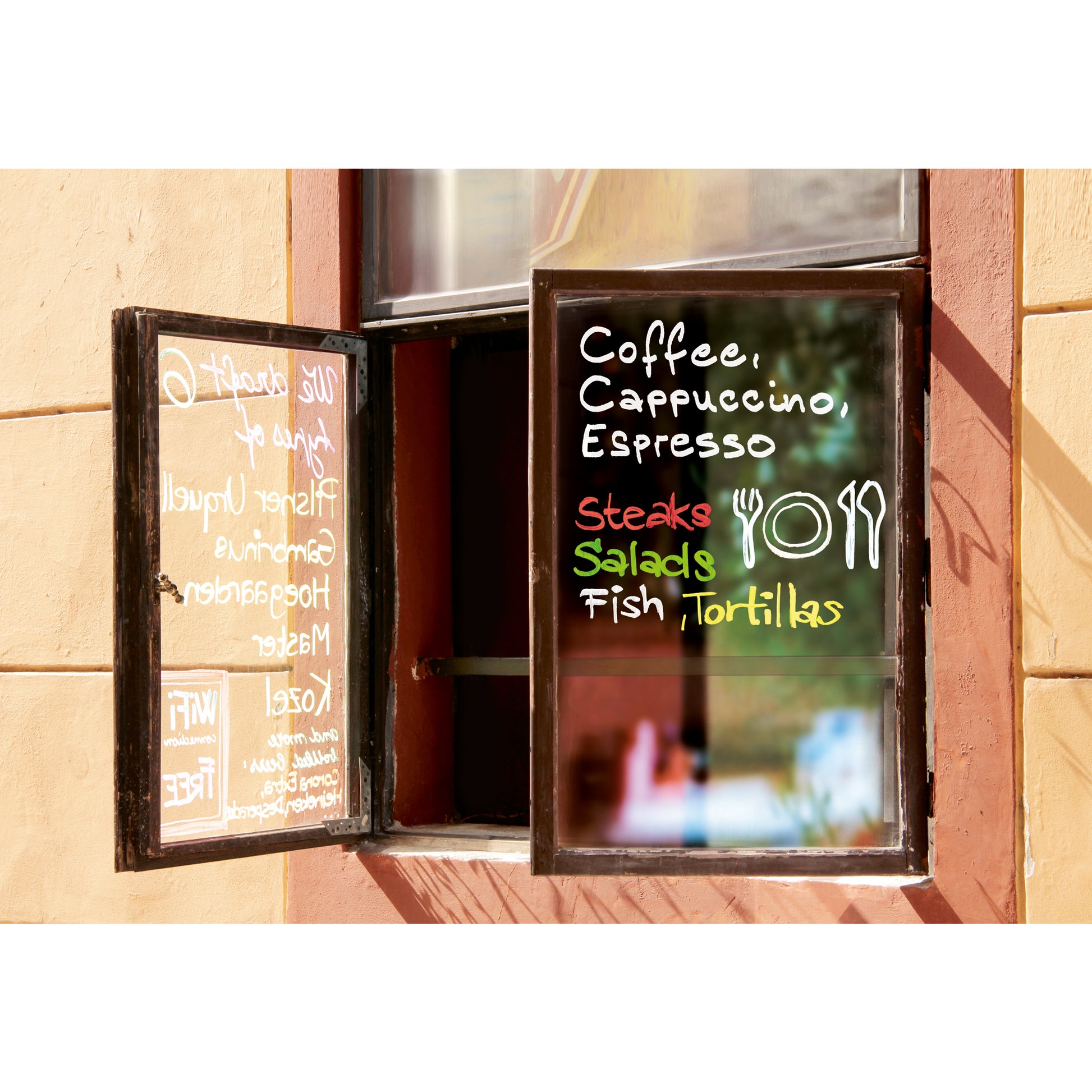 zum Gestalten, Verzieren und Beschriften von z.B. Fenstern, dunklen Tafeln, Glas und Spiegeln. Ist von fast allen geschlossenen Oberflächen feucht abwischbar.