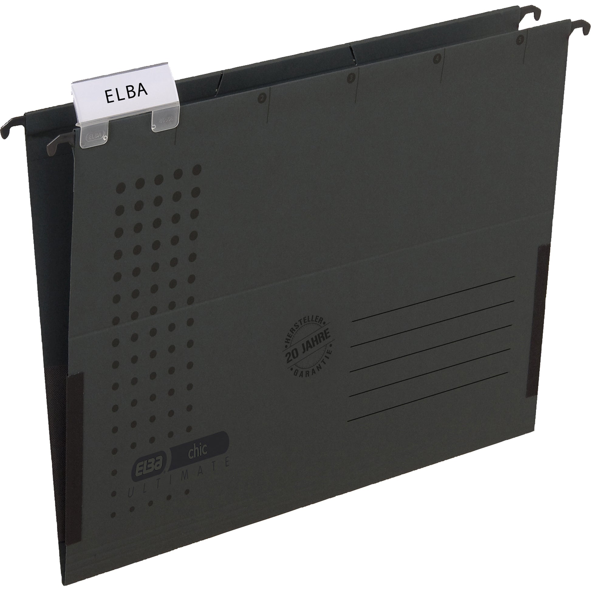 Exklusiver, starker Karton verhindert das Ausreißen des Kartons bei intensivem Gebrauch. Komfortsichtreiter mit aufklappbarer Rückwand und auswechselbarem Beschriftungsschildchen. Schlitzstanzung für Einhängeheftstreifen 100551905. Extrem steife Metallhängeschienen mit pulverbeschichteten Enden.