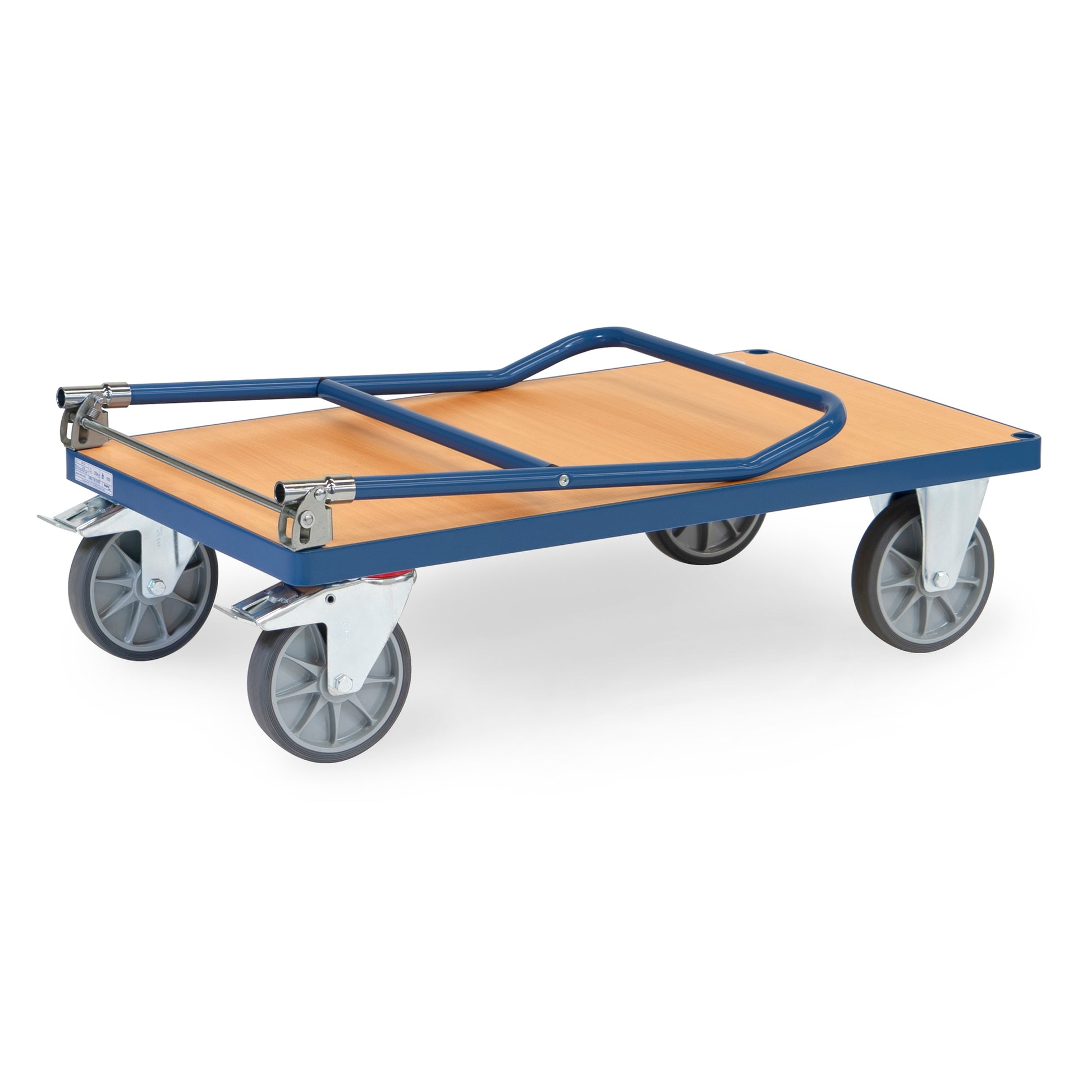 Ladefläche aus Holzwerkstoffplatte, Oberfläche Buchendekor. 2 Lenk- und 2 Bockrollen. Naben mit Rillenkugellager. Feststeller an den Lenkrollen.