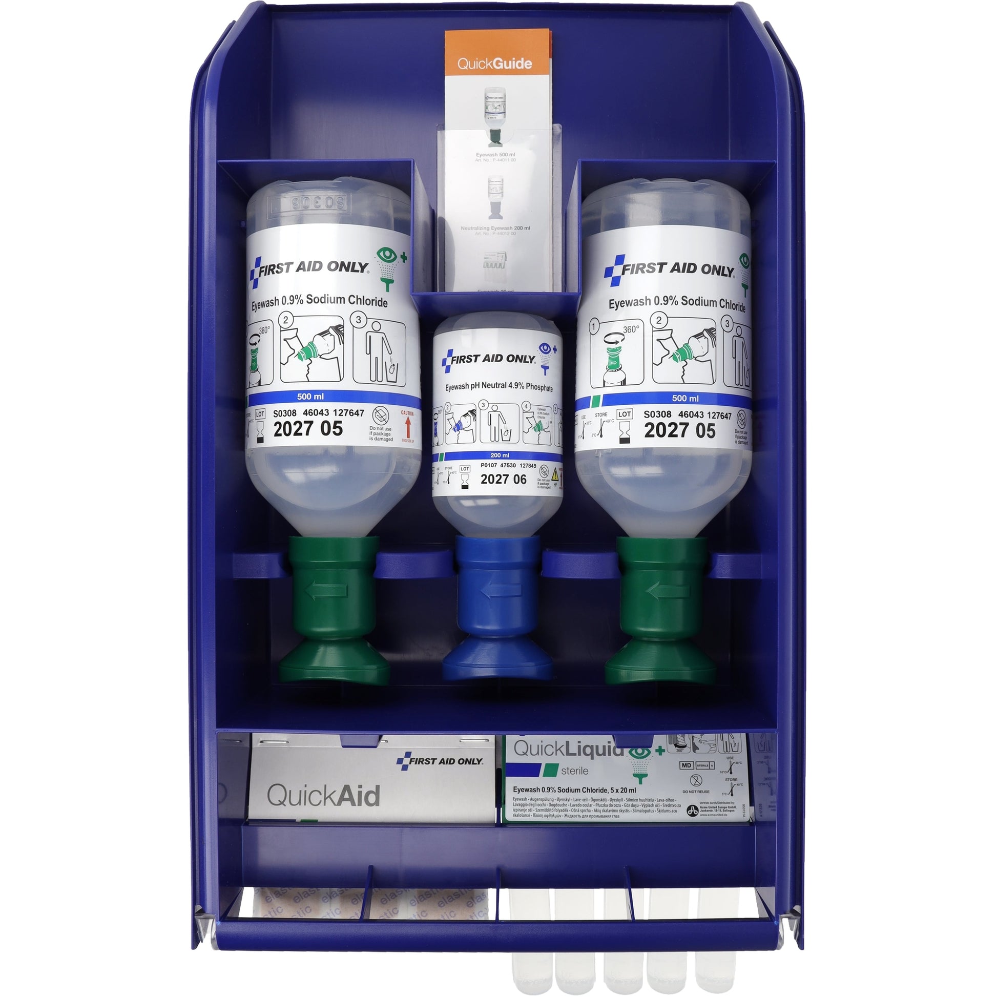 | Ausführung des Inhalts (bzgl. der Hauptausstattungsteile) | 2 x Augenspülflasche 500 ml Kochsalzlösung (0,9%), 1 x Augenspülflasche 200 ml Phosphatpufferlösung (4,9%), 5 x Augenspüllösung QuickLiquid 20 ml, 1 x QuickAid elastische Pflaster (45 Stück), 1x Broschüre |