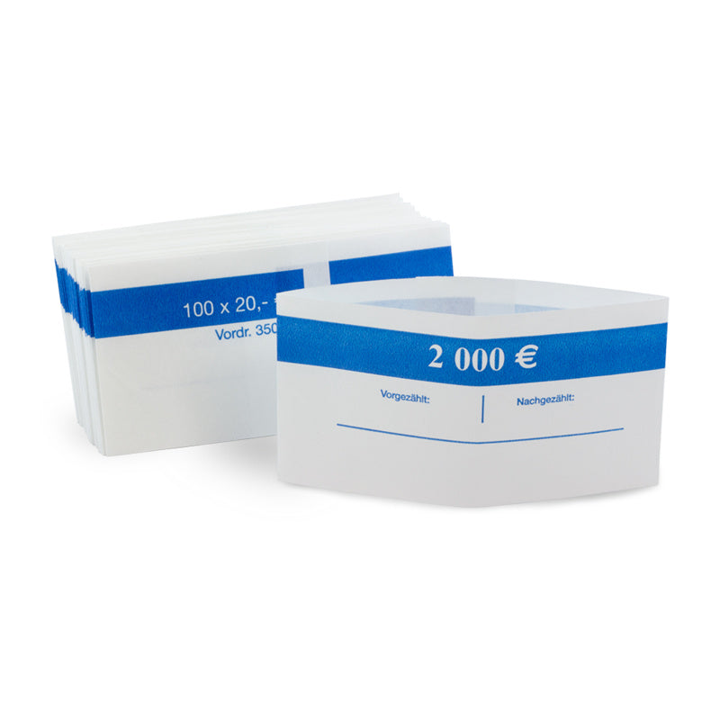 Geldschein-Banderolen eignen sich hervorragend für die Herstellung von bankengerechten Notenbündeln. Sie sind zu Schlaufen geklebt und für alle Euro-Banknoten erhältlich. Die leichte Sortendifferenzierung wird durch die unterschiedliche Druckfarbe sichergestellt.