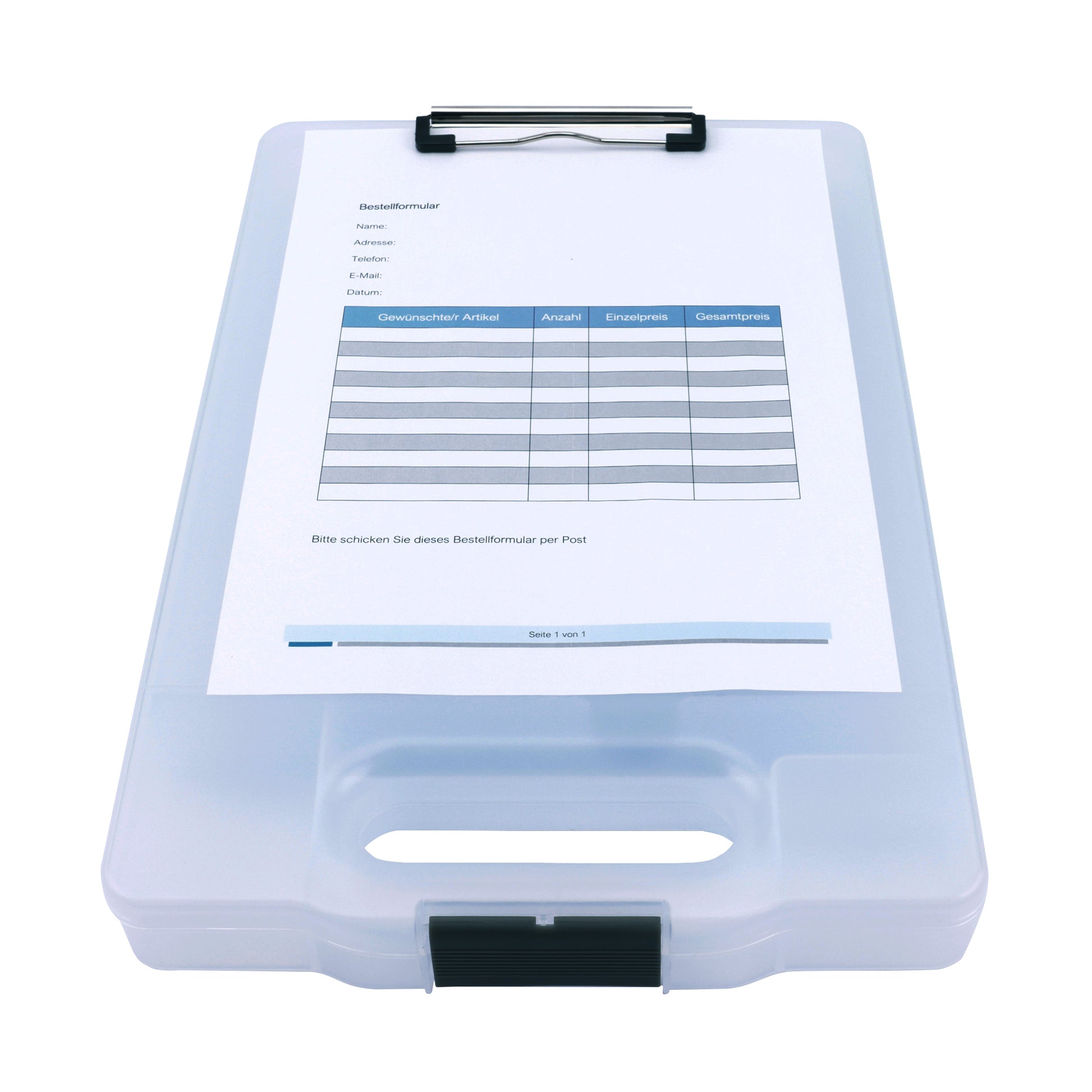 Klemmbrett mit großem Aufbewahrungsfach für den professionellen Einsatz. Das große Aufbewahrungsfach mit einer Füllhöhe von 34 mm dient als Organizer und bietet viel Platz und Schutz für Tablet, Handy, Formulare, weitere Papiere, Taschenrechner etc. Separate Fächer im Inneren dienen als Kleinteile-Box zur Aufbewahrung von z.B. Kugelschreiber, Bleistifte, Büroklammern etc. Der Clip im Griff verschließt das gesamte Aufbewahrungsfach.