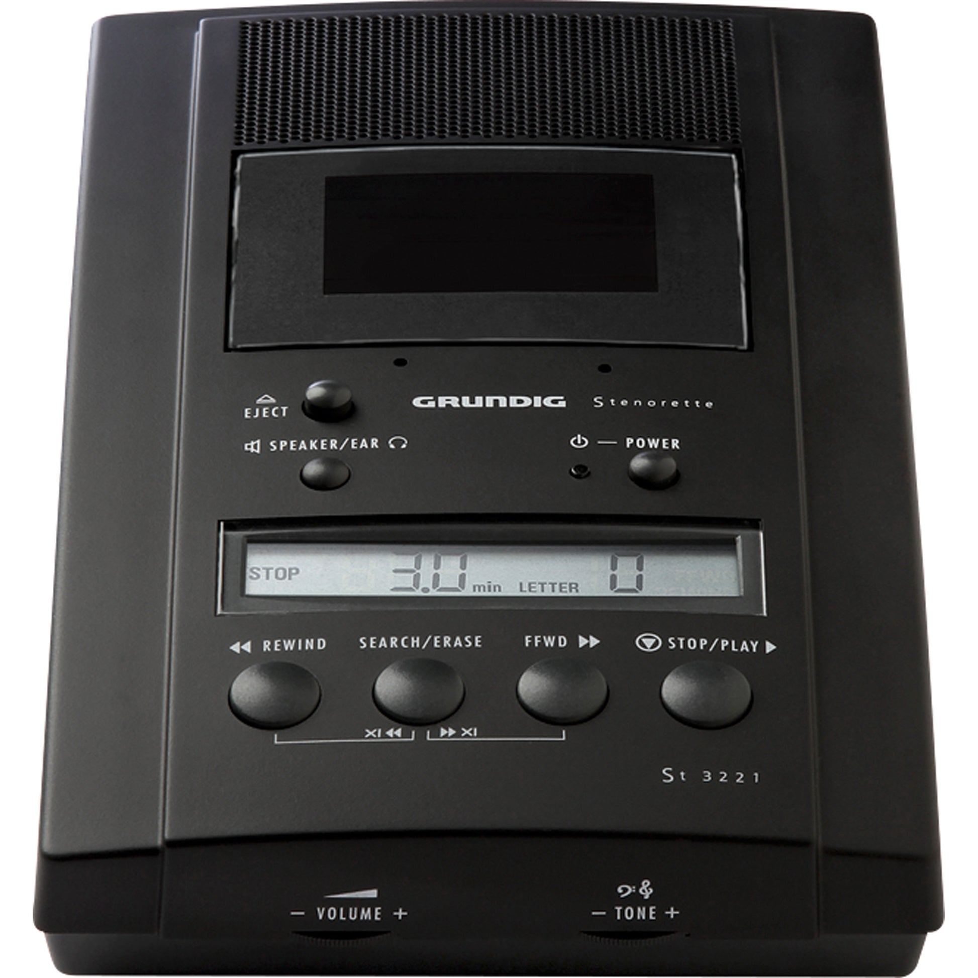 Die Stenorette St 3221 ist eine professionelle Wiedergabestation. Mit ihr können Sie Diktate von einer Steno-Cassette abspielen. Die Abspielgeschwindigkeit können Sie hierfür so einstellen, dass sie Ihrer Schreibgeschwindigkeit entspricht. Die Tischstation verfügt über Anschlüsse für diverses Zubehör (nicht im Lieferumfang) wie Fußschalter und Kopfhörer. So steht Ihnen in Kürze ein vollständiger Schreibplatz zur Verfügung. Das Display zeigt Ihnen die Gesamtzahl der Diktate, die Diktatnummer und die Minuten an.