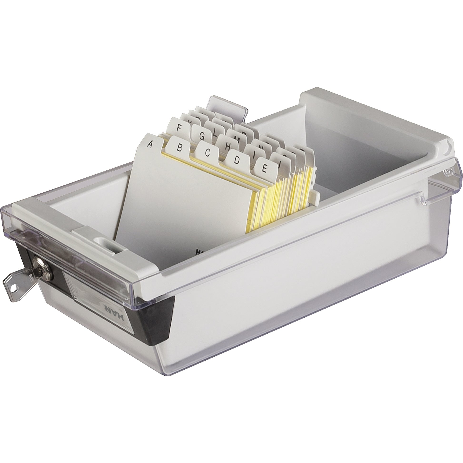 Die perfekte Verwahrung für vertrauliche Informationen in gehobener Ausführung. Praktische Zusatzfunktion: Der Karteikasten kann während der Bearbeitung platzsparend in den Deckel gestellt werden. Rutschfeste, möbelschonende Gummifüße bieten einen sicheren Stand.