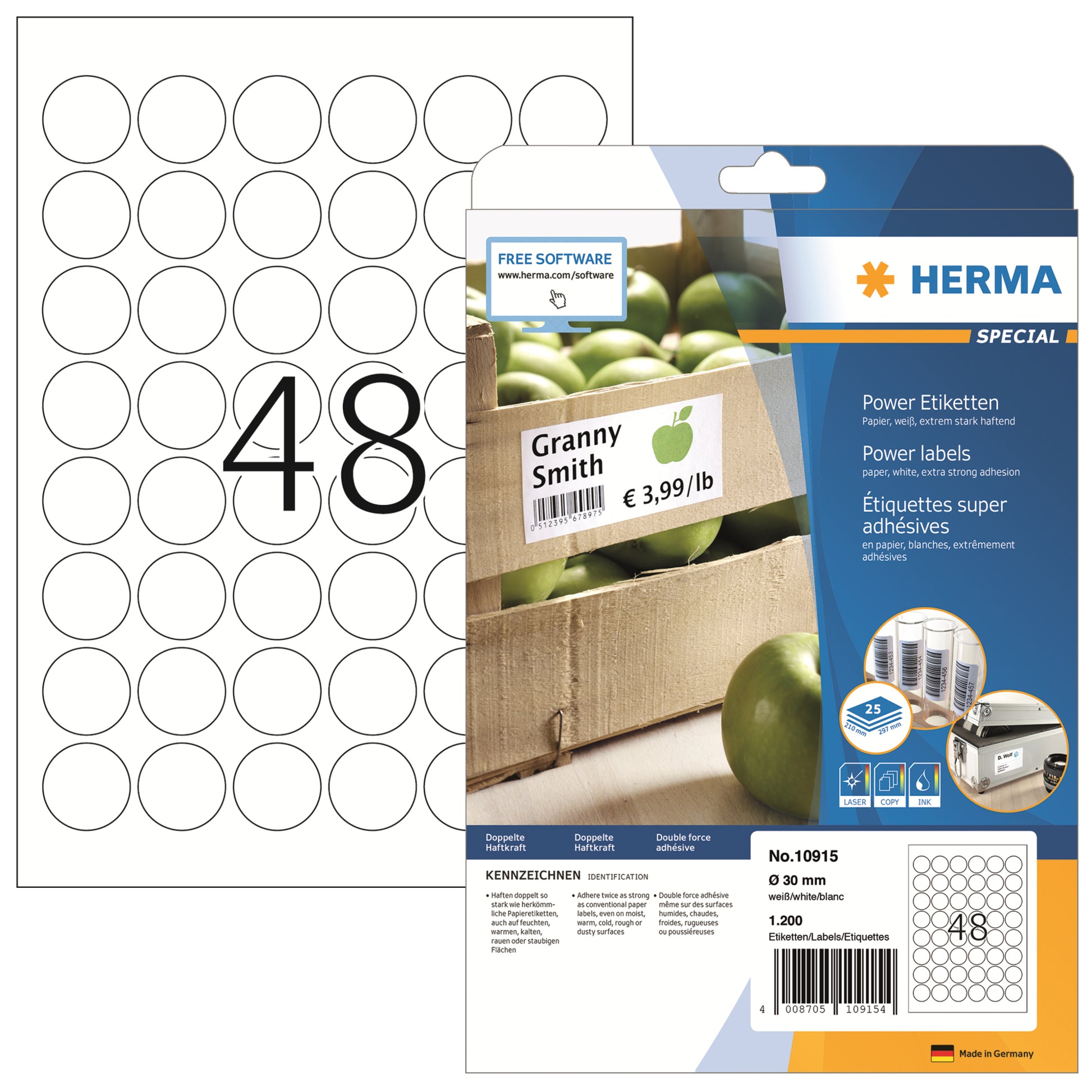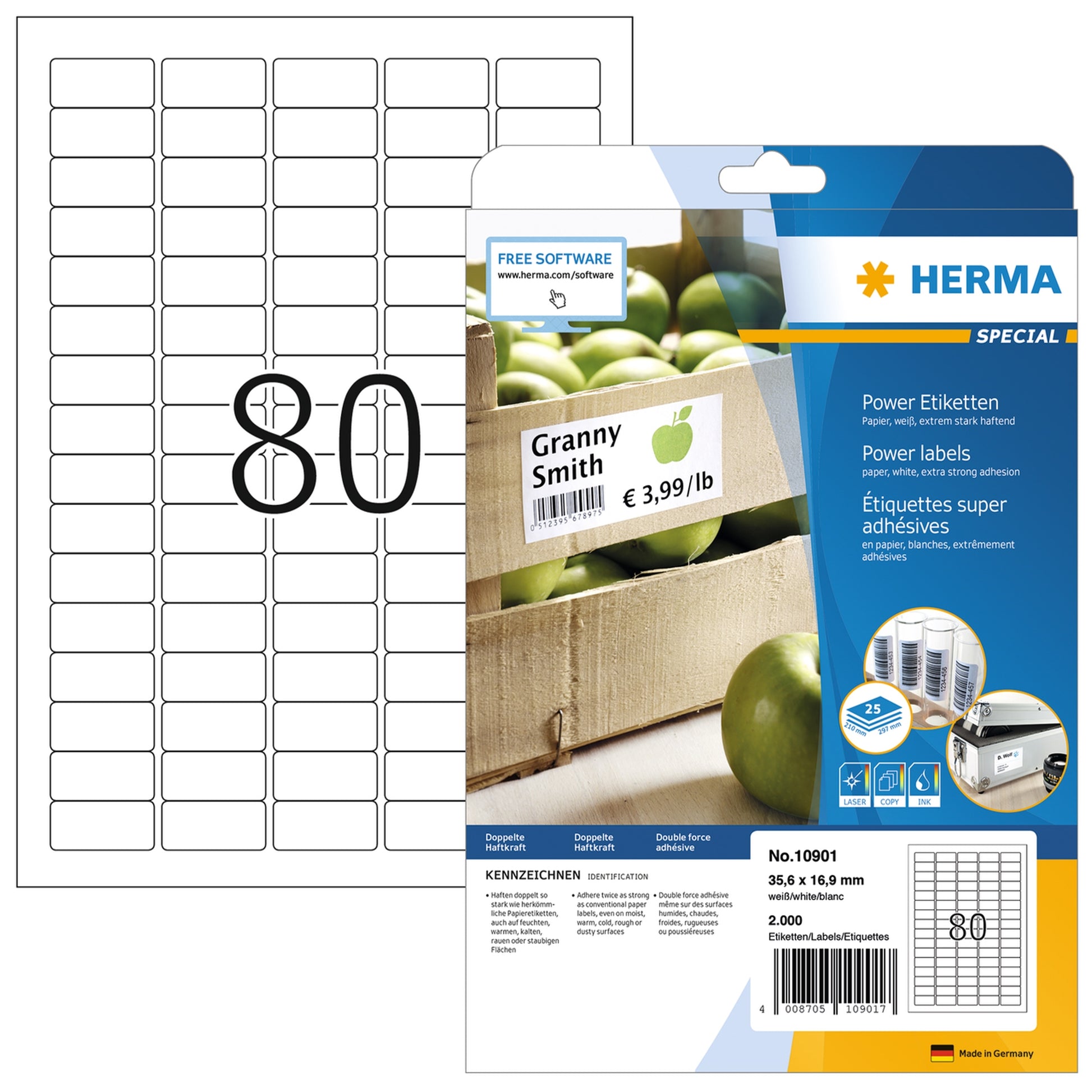 Haften doppelt so stark wie herkömmliche Papieretiketten, auch auf kritischem Untergrund, z.B. feuchten, warmen, kalten, rauen oder staubigen Flächen. Ideal zur sicheren Kennzeichnung von Produkten, Dokumenten und Inventar, für Sicherheits- und Warnhinweise, für Rundbeklebung, als Prüfplakette oder Verschlussetikett, im Innenbereich. Kostenlose Softwarelösungen: www.herma.de/software. Störungsfreie Verarbeitung durch Rundum-Sicherheitskante und optimale Planlage.
