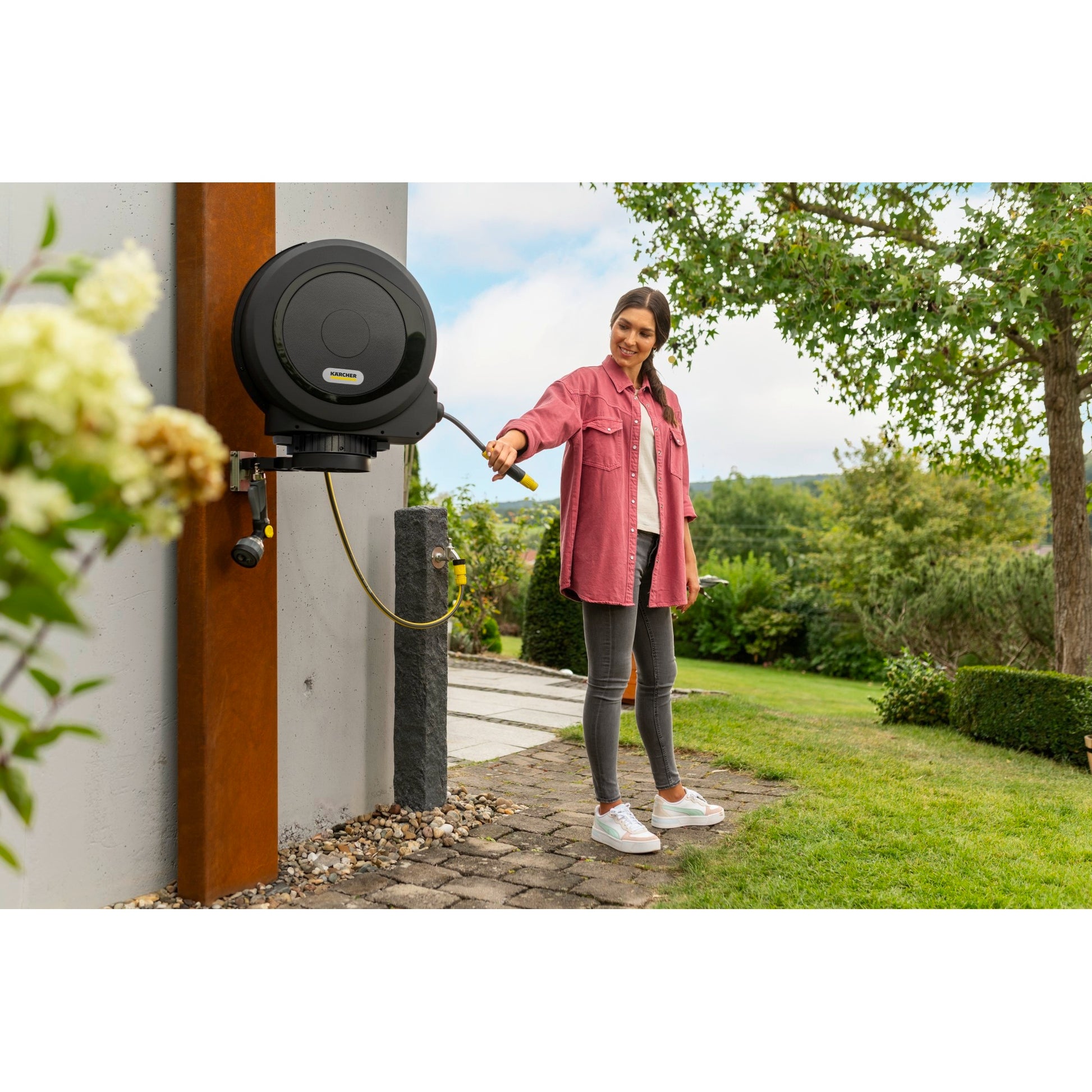 Die stilvolle Schlauchbox wird platzsparend an der Wand montiert und mit einem Verbindungsschlauch an den Wasserhahn angeschlossen. Der Gartenschlauch ist einfach auszuziehen. Dabei gibt es entsprechende Arretierstufen: Der Schlauch rastet vollautomatisch in kurzen Abständen ein. Durch einen leichten Zug am Schlauchende löst sich die Arretierung, sodass sich der Schlauch automatisch und kontrolliert, ohne Knicke und Knoten einzieht. Mit dem innovativen Montagesystem FlexChange kann die Schlauchbox werkzeuglos von der Wandhalterung abgenommen werden. Dies dient zur einfachen Verstauung im Winter oder auch für den flexiblen Einsatz. Die Schlauchbox ist zudem UV- wie auch frostsicher und kann deshalb das ganze Jahr an der Hauswand platziert werden. Zum Diebstahlschutz kann ein Kabelschloss angebracht werden. Keine Hersteller- und keine Verkäufergarantieansprüche bei gewerblicher Nutzung.