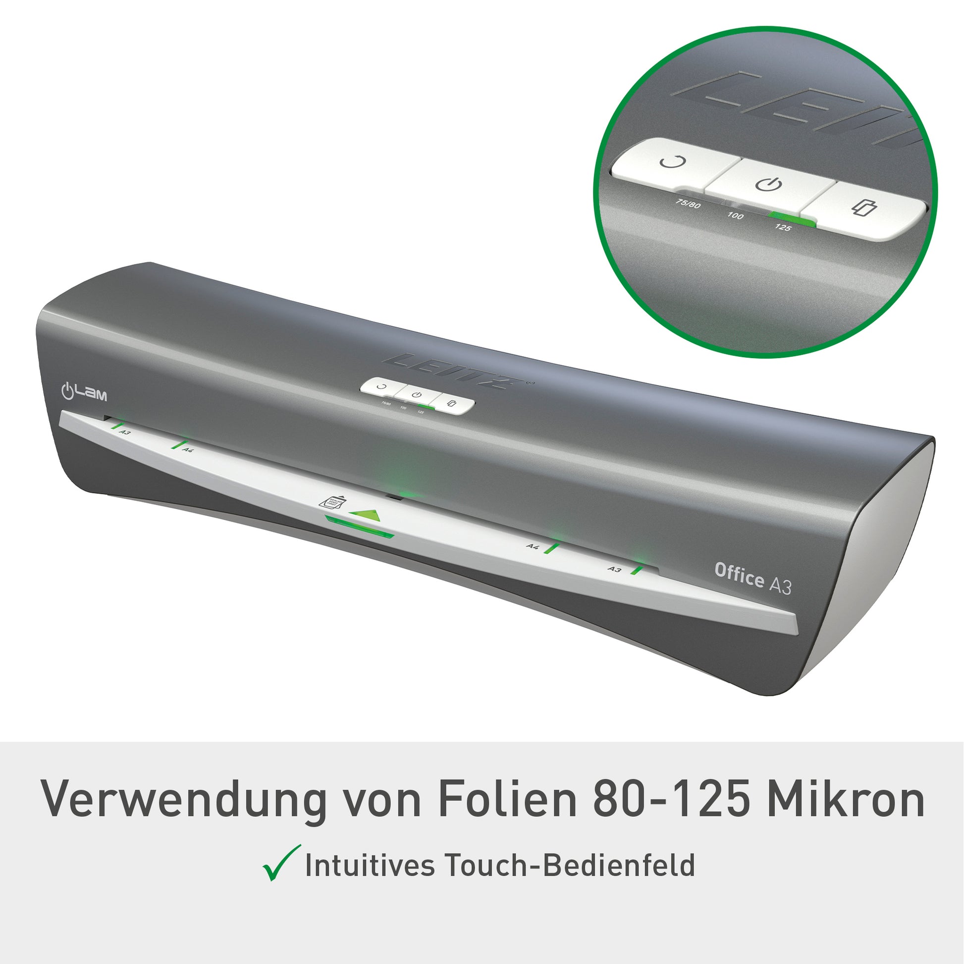 Entdecken Sie das Leitz Laminiergerät iLAM Office für DIN A3 - die perfekte Lösung für alle, die Dokumente, Fotos und wichtige Unterlagen professionell und langlebig schützen möchten. Mit diesem hochwertigen Laminiergerät erzielen Sie mühelos brillante Ergebnisse und verleihen Ihren Materialien eine ansprechende Optik. Das iLAM Office überzeugt durch seine benutzerfreundliche Handhabung und schnelle Aufheizzeit, sodass Sie im Handumdrehen mit dem Laminieren beginnen können. Dank der vielseitigen Einsatzmöglichkeiten ist es ideal für den Einsatz im Büro, in Schulen oder zu Hause. Ob für Präsentationen, kreative Projekte oder das Archivieren von Dokumenten - dieses Laminiergerät erfüllt alle Anforderungen. Die robuste Bauweise und die hohe Verarbeitungsqualität garantieren eine lange Lebensdauer, während die Möglichkeit, verschiedene Laminierfolien zu verwenden, Ihnen Flexibilität bei der Auswahl der gewünschten Stärke bietet. Zudem sorgt die gleichmäßige Wärmeverteilung für ein perfektes Laminierergebnis ohne Falten oder Blasen. Mit dem Leitz iLAM Office investieren Sie in ein zuverlässiges Gerät, das Ihnen hilft, Ihre Unterlagen optimal zu schützen und gleichzeitig einen professionellen Eindruck zu hinterlassen. Machen Sie Ihre Dokumente widerstandsfähig gegen Abnutzung und Feuchtigkeit und genießen Sie die Sicherheit, dass Ihre wichtigen Informationen bestens aufgehoben sind. Bestellen Sie jetzt und bringen Sie Ihre Laminierprojekte auf das nächste Level! Laminator mit schlankem Design und High Speed Vorheizen. Mit Freigabeschalter, um verklemmte Dokumente zu entnehmen. Mit indirekter Heizung über den Rollen. Niedriger Energieverbrauch, automatische Abschaltung nach 30 Minuten, wenn nicht im Gebrauch. LED-Bereitschaftsanzeige und Warnton. Empfohlen für die Verwendung mit Leitz UDT Folien. Leitz startet im Aktionszeitraum vom 01. Oktober bis 31. März 2026 eine Cashback-Kampagne auf ausgewählte Aktenvernichter und Laminiergeräte. Gehen Sie auf https://www.leitz.com/de-de/promotions/cashback, um Ihren Beleg einzureichen und zu sparen!