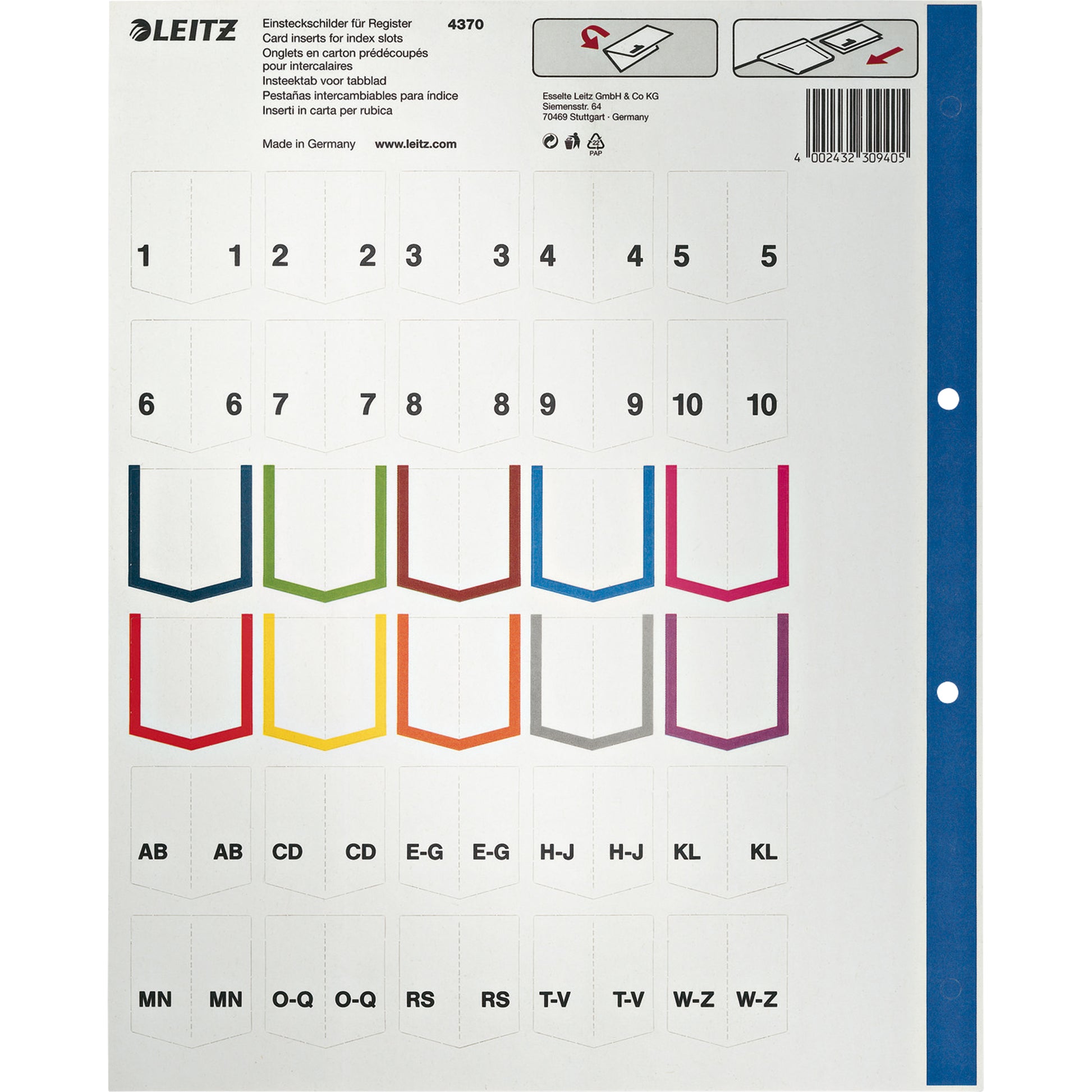 Plastikregister, mit beschriftbarem Deckblatt aus Karton, auswechselbare Einsteckschildchen für mehrfache Verwendung, mit Farbrand.
