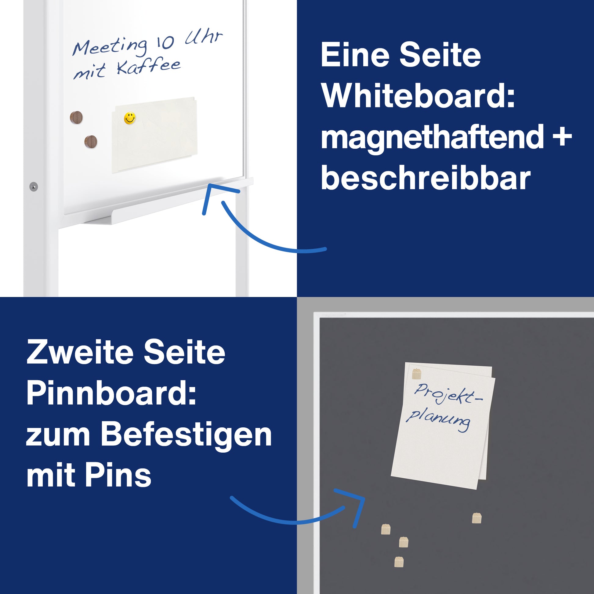 Das perfekte und Platz sparende Präsentationsmittel mit 3 Funktionen: die 3-in-1 Kombination bietet auf einer Seite eine weiße, speziallackierte und magnethaftende Schreibtafeloberfläche inkl. aufsteckbare Papierhalter (auf alle Blockgrößen einstellbar). Die andere Seite ist mit einer blauen oder grauen Filzoberfläche zum Anpinnen ausgestattet. 5 Jahre Garantie auf die Oberfläche.