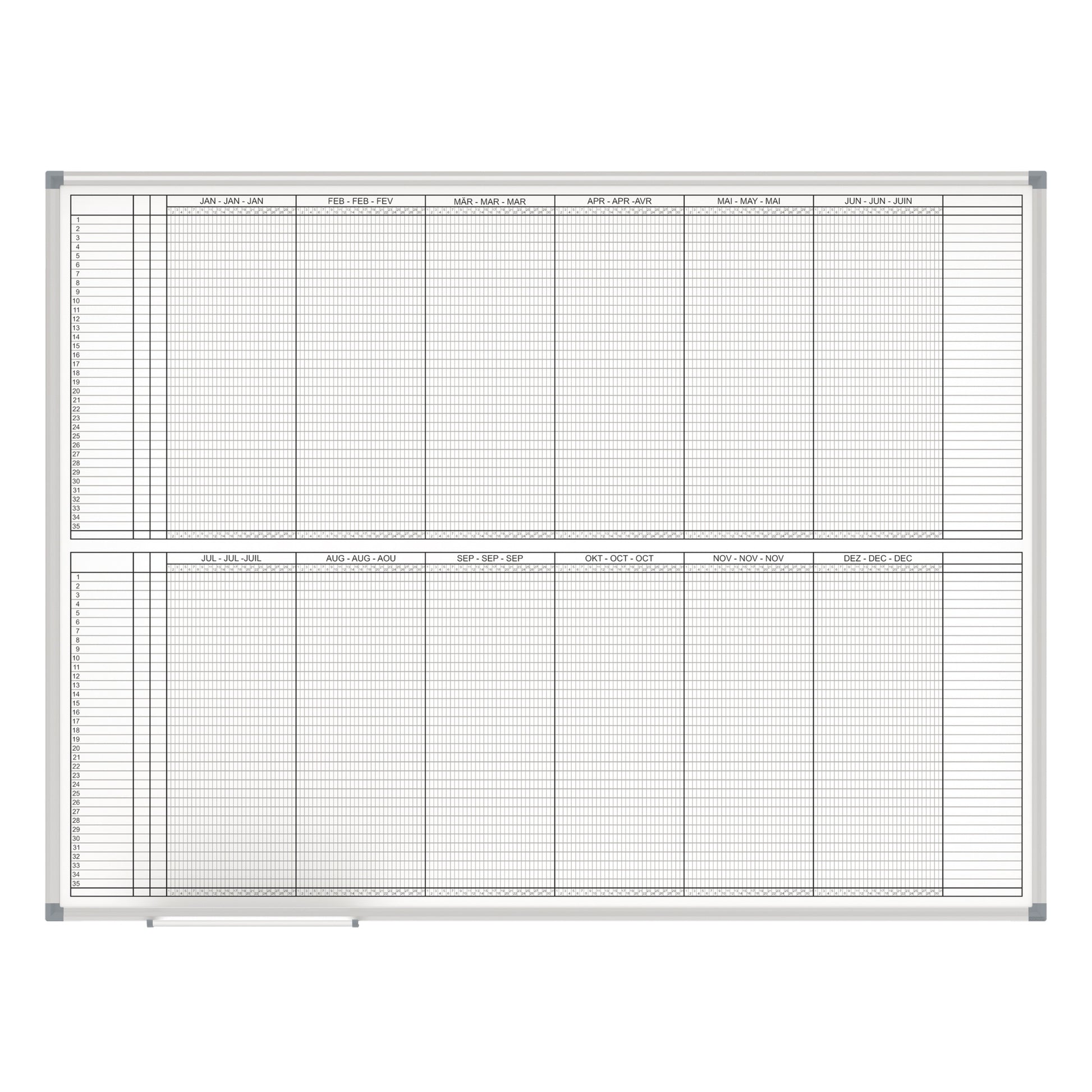 Für eine moderne, flexible und schnelle Organisation. Selbst komplexe Planungen und Arbeitsabläufe sind schnell überschaubar. Schnelle Veränderungen möglich. Leichtgewicht: Gut zu transportieren und zu montieren. Wiederholung der Tage in der untersten Zeile zur besseren Orientierung. Eine Vorspalte für Personen/Objekte plus zwei weitere Detailspalten. Zur Planung von bis zu 70 Personen in der Halbjahresübersicht oder 35 Personen in der Ganzjahresübersicht.