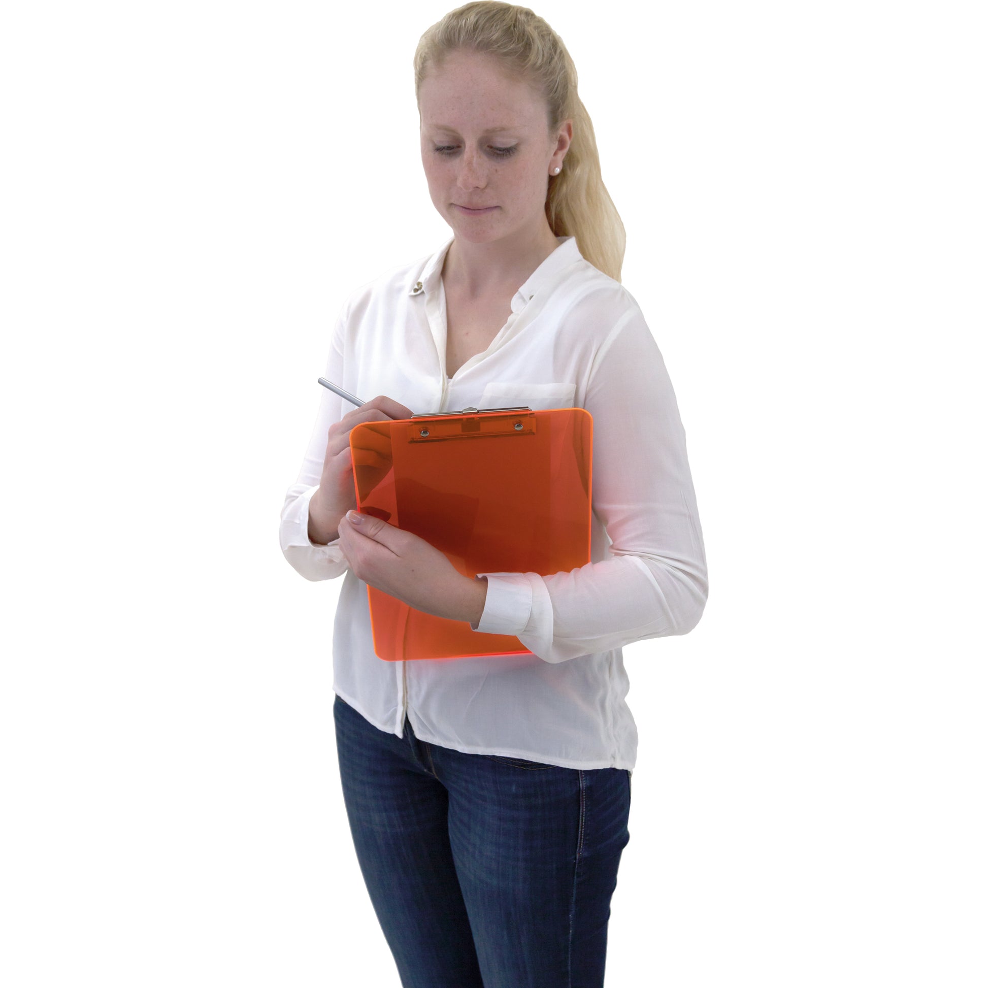 Die Schreibplatte für Preisbewusste. Bügelklemme mit Griffmulde, auch zum Aufhängen. Recycelbar.