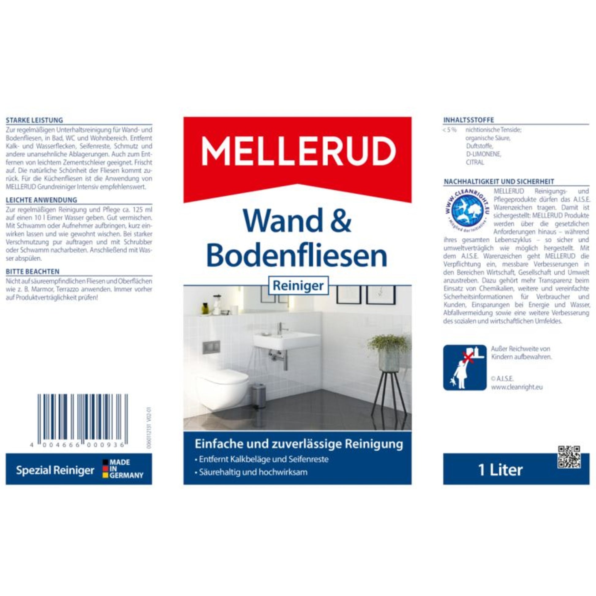 Unser MELLERUD Wand- & Bodenfliesen-Reiniger ist ein Spezialreiniger zur regelmäßigen Unterhaltsreinigung Ihrer Wand- und Bodenfliesen im Badezimmer, WC und Wohnbereich. Zuverlässig werden selbst hartnäckige Kalk- und Wasserflecken, Seifenreste, Schmutz und andere unansehnliche Ablagerungen entfernt. Aufgrund der leicht säurehaltigen Spezialrezeptur können Sie selbst leichte Zementschleier von Ihren Wand- und Bodenfliesen mit diesem Produkt entfernen. Zudem wirkt der MELLERUD Wand- & Bodenfliesen-Reiniger farbauffrischend, sodass die behandelten Oberflächen ihre natürliche Schönheit und Struktur zurückerlangen. Damit ist dieser hochwirksame Reiniger das ideale Produkt zur mühelosen und gründlichen Reinigung Ihrer Fliesen im Haushalt. Sie können also sicher sein, dass Ihre Fliesenreinigung dank des MELLERUD Wand- & Bodenfliesen-Reinigers erheblich effizienter gelingt, als Sie es gewohnt sind, und die behandelten Oberflächen wie neu erstrahlen.