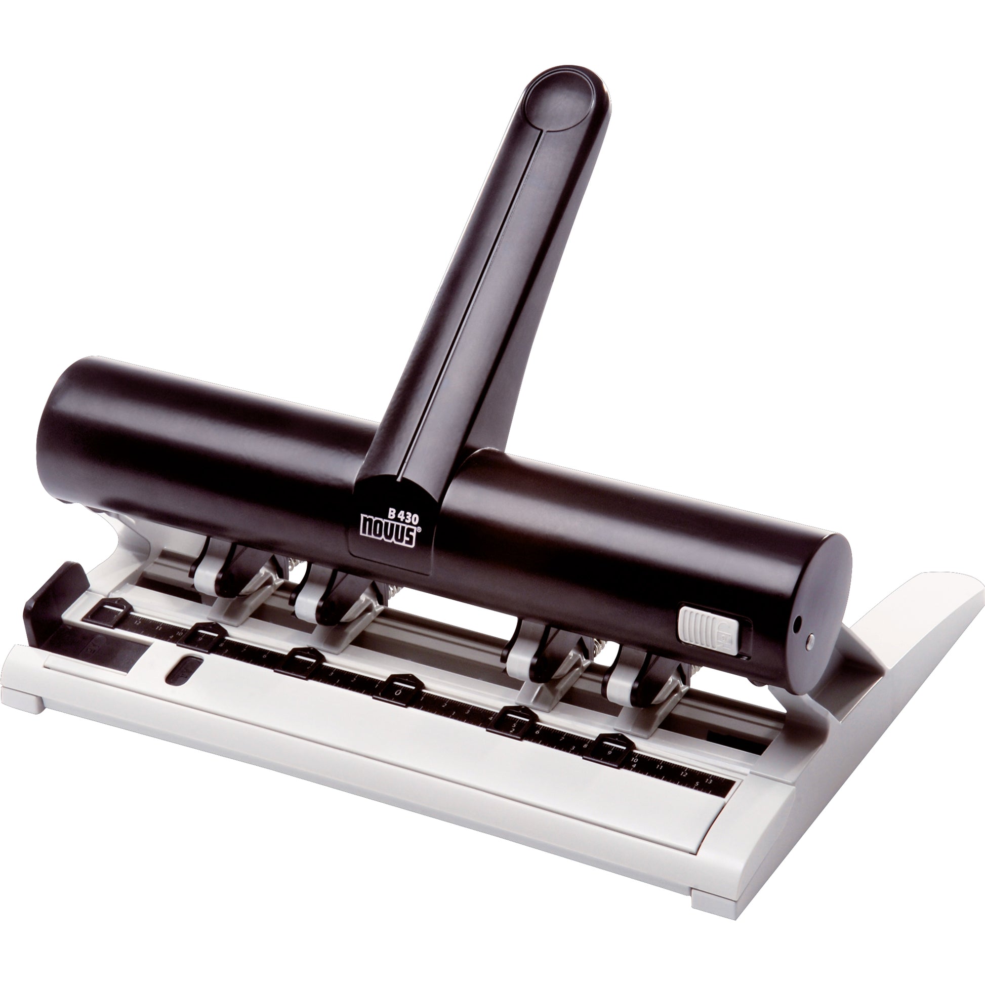 Der NOVUS B 430 ist ein anwenderfreundlicher Mehrfachlocher, der zum Beispiel ideal für Zeitmanagementsysteme geeignet ist. Die vier separaten Lochelemente mit Federmechanik sind leicht einstellbar, die patentierte, abnehmbare Justiereinheit ermöglicht die komfortable Einstellung der Lochformate. Rutschfeste Füße sorgen für einen sicheren Stand. Der Hebel mit Arretierungstaste ermöglicht eine Platz sparende Aufbewahrung.