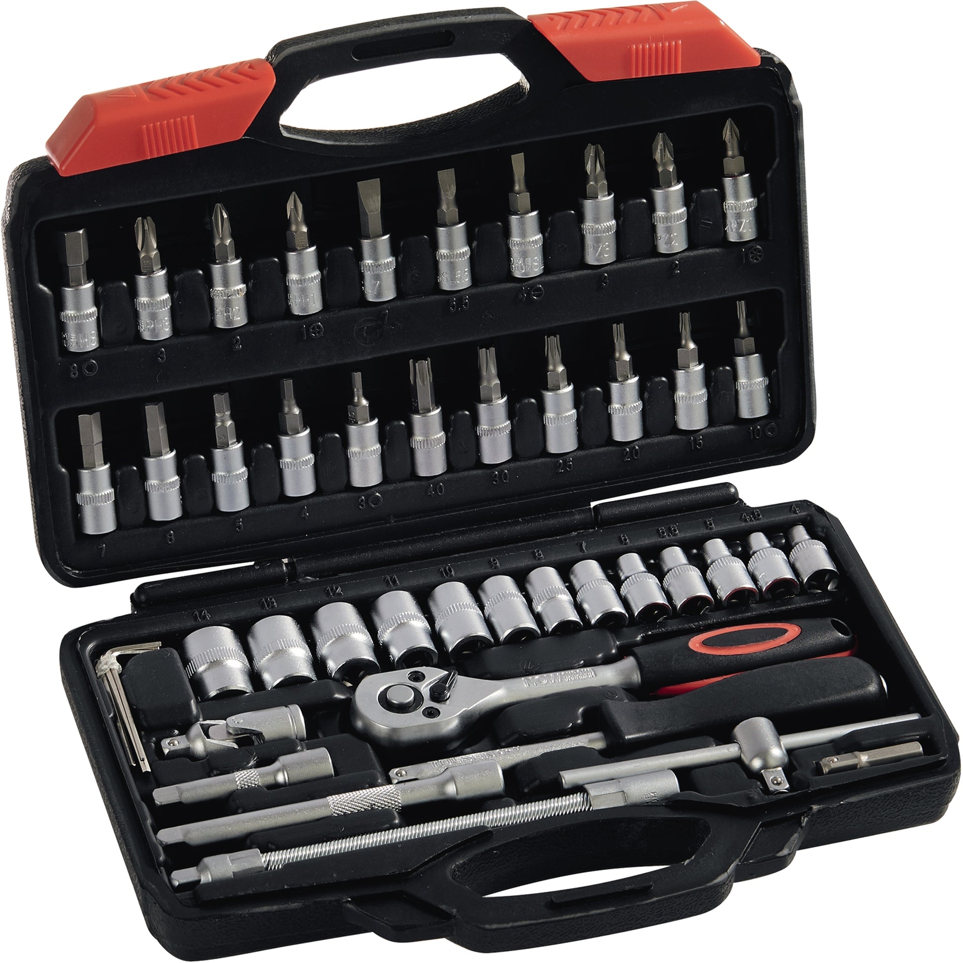 Rückschwenkwinkel: 5°. Inhalt: Mit 6,3 mm (1/4")-Vierkantantrieb: 1 Hebel-Umschaltknarre (72 Zähne) mit 2-Komponentengriff und Nussverriegelungsfunktion mit Druckknopfauslösung, je 1 Sechskant-Steckschlüssel-Einsatz (4/4,5/5/5,5/6/7/8/9/10/11/12/13/14 mm), je 1 Sechskant-Tiefbett-Steckschlüssel-Einsatz (4/5/6/7/8/9/10 mm), je 1 Steckschlüssel-Einsatz für Schrauben mit Außen-TORX®-Profil (E 4/5/6/7/8), je 1 Steckschlüssel-Einsatz für Schrauben mit Innen-TORX®-Profil (T 8/9/10/15/20/25/27/30), je 1 Steckschlüssel-Einsatz für Schrauben mit Innen-TORX®-Profil mit Sicherungsstift (T 8/9/10/15/20/25/27/30), je 1 Steckschlüssel-Einsatz für Schrauben mit Kreuzschlitz (PH 0/1/2), je 1 Steckschlüssel-Einsatz für Schrauben mit Kreuzschlitz (PZD 0/1/2), je 1 Steckschlüssel-Einsatz für Schlitzschrauben (4/4,5/6,5/7 mm), je 1 Steckschlüssel-Einsatz für Schrauben mit Innensechskant-Profil (3/4/5/6 mm), je 1 Verlängerung (50/100 mm), 1 Quergriff mit Gleitstück 110 mm, 1 Kardangelenk, 1 Handgriff mit Vierkant 6,3 mm (1/4"), 1 Adapter 6,3 mm (1/4")-Innenvierkant auf 6,3 mm (1/4")-Innensechskant zum Antrieb von Bits mit einer Knarre. Mit mit 10,0 mm (3/8")-Vierkantantrieb: 1 Hebel-Umschaltknarre (72 Zähne) mit 2-Komponenten-Griff und Nussverriegelungsfunktion mit Druckknopfauslösung, je 1 6-kant-Steckschlüssel-Einsatz (10/11/12/13/14/15/16/17/18/19 mm), je 1 6-kant-Tiefbett-Steckschlüssel-Einsatz (10/11/12/13/14/15 mm), je 1 Steckschlüssel-Einsatz für Schrauben mit Außen-TORX®-Profil (E 10/11/12/14/16/18), 1 Verlängerung 125 mm, 1 Kardangelenk, 1 Zündkerzen-Einsatz 18 mm, 1 Adapter 10 mm (3/8?)-Innenvierkant auf 7,94 mm (5/16?)Innensechskant zum Antrieb von Bits mit einer Knarre. Mit 12,5 mm (1/2")-Vierkantantrieb: 1 Hebel-Umschaltknarre (72 Zähne) mit 2-Komponenten-Griff und Nussverriegelungsfunktion mit Druckknopfauslösung, je 1 6-kant-Steckschlüssel-Einsatz (10/11/12/13/14/15/16/17/18/19/20/21/22/24/27/30/32 mm), je 1 6-kant-Tiefbett-Steckschlüssel-Einsatz (16/17/18/19/22 mm), je 1 Steckschlüssel-Einsatz für Schrauben mit Außen-TORX®-Profil (E 20/24), je 1 Zündkerzen-Einsatz (16/21 mm), 1 Kardangelenk, je 1 Verlängerung (125/250 mm), 1 Griff mit Gleitstück 250 mm, 1 Vergrößerungsstück 10 mm (3/8") auf 12,5 mm (1/2"), 1 Adapter 12,5 mm (1/2")-Innenvierkant auf 7,94 mm (5/16")-Innensechskant zum Antrieb von Bits mit einer Knarre. Mit je 1 Sechskant-Stiftschlüssel (SW 1,27/1,5/2/2,5/3/4/5 mm), je 1 Bit 6,3 mm (1/4") für Schrauben mit Innen-TORX®-Profil (T 5/6/7), je 1 Bit 6,3 mm (1/4") für Schrauben mit Innen-TORX®-Profil und Sicherungsstift (T 7/10/15/20/25/27/30/40/45), je 1 Bit 7,94 mm (5/16") für Schlitzschrauben (8/10/12 mm), je 1 Bit 7,94 mm (5/16") für Schauben mit Kreuzschlitz (PH 3/4), je 1 Bit 7,94 mm (5/16") für Schrauben mit Kreuzschlitz (PZD 3/4), je 1 Bit 7,94 mm (5/16") für Schrauben mit Innen-TORX®-Profil (T 40/45/50/55/60/70), je 1 Bit 7,94 mm (5/16") für Schrauben mit Innen-TORX®-Profil und Sicherungsstift (T 40/45/50/55/60/70), je 1 Bit 6,3 mm (1/4") für Schrauben mit Spline-Profil (M 5/6/8), je 1 Bit 6,3 mm (1/4") für Schrauben mit Ribe-Profil (RM 5/6/7/8/9), je 1 Bit 8 mm (5/16") für Schrauben mit Innensechskant-Profil (7/8/10/12/14 mm).