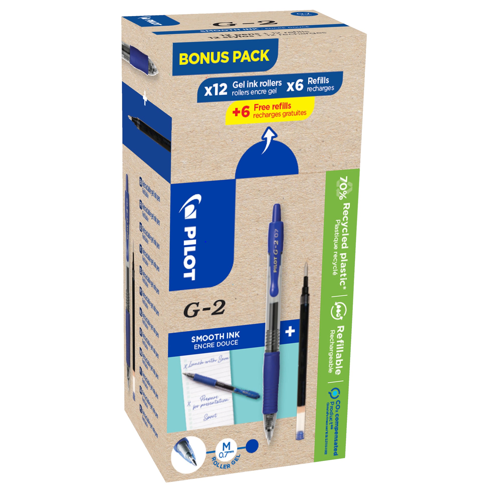 Der Gelschreiber G2-7 ist der der Klassiker unter den Gelschreibern. Weiches und angenehmes Schreiben. Edelstahlspitze mit Wolfram-Karbid-Kugel. Jederzeit sichtbarer Tintenstand dank transparentem Gehäuse. Besteht zu >70 % aus recyceltem Plastik (ohne Nachfüllungen und plastikfreie Komponenten).