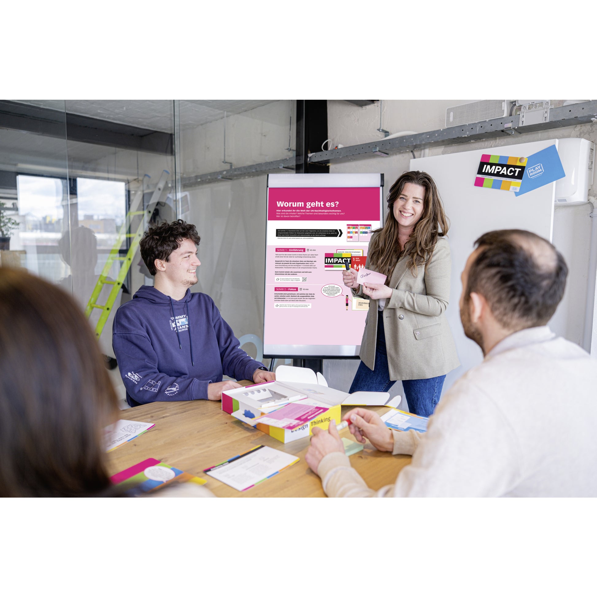 | Ausführung des Inhalts (bzgl. der Hauptausstattungsteile) | je 1 x IMPACT FLIP, Moderationskarten, GECKO Box, 2 x GOAL Karten (SDG Karten) |