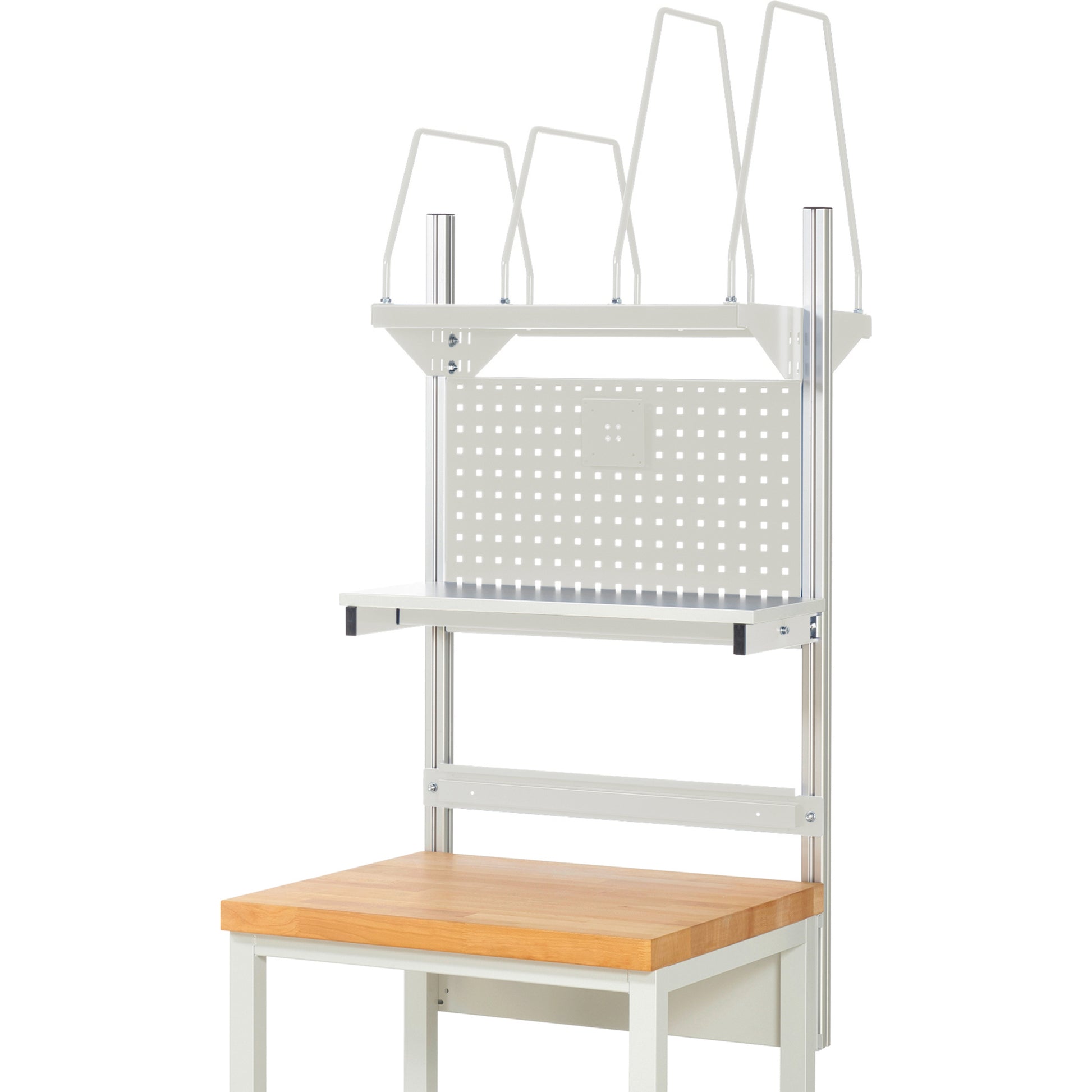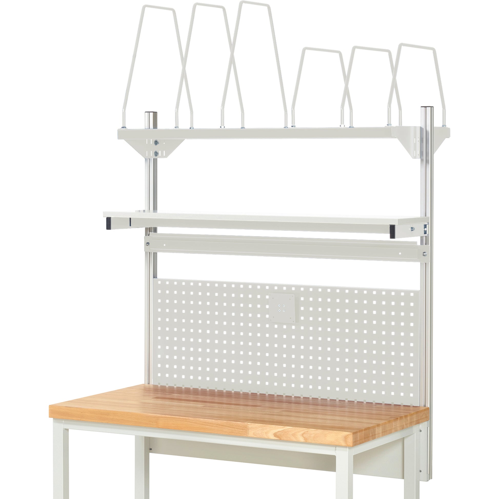 Set bestehend aus: 1 Befestigungssatz (Querträger) mit 2 System-Stützen, 1 Lochplatte (450 mm hoch) mit 4-Kant Systemlochung (Lochung 10 x 10 mm, Abstand Lochmitte-Lochmitte 38 mm) zur Aufnahme von Lochplatten-Zubehör. 1 Etagenbord, melaminbeschichtet (300 mm tief). 1 Halteschiene für Aufnahme von Sichtlagerkästen (offene Einhängekante an der Rückseite der Sichtlagerkästen erforderlich). 1 Flachbildschirmhalter mit Montageadapter für Lochplatte (VESA MIS-D 75/100). 1 Kartonagenmagazin, melaminbeschichtet (600 mm tief), mit Montagekonsolen und vorne sowie hinten angebrachtem C-Profil zu variablen Positionierung der Steckbügel mittels Systembolzen. Einbauhöhe der Anbauelemente innerhalb der System-Stützen verstellbar. Der Befestigungssatz (Querträger) wird hinten unter der Arbeitsplatte an den Systemunterbau angebracht. Die 2 System-Stützen (Aluminiumprofil 40 x 40 mm) werden mittels Nutensteinen an den Befestigungssatz (Querträger) angeschraubt (Höhe einstellbar) und laufen hinter der Arbeitsplatte nach oben, so dass die gesamte Tiefe der Arbeitsplatte frei bleibt (kein Verschrauben auf der Arbeitsplatte). Die System-Stützen verfügen an allen 4 Seiten über eine Profilnut, so dass eine allseitige Nutzung möglich ist. Die 2 System-Stützen werden links und rechts außen angeschraubt, so dass 1 Systemfeld in der Systembreite entsteht.