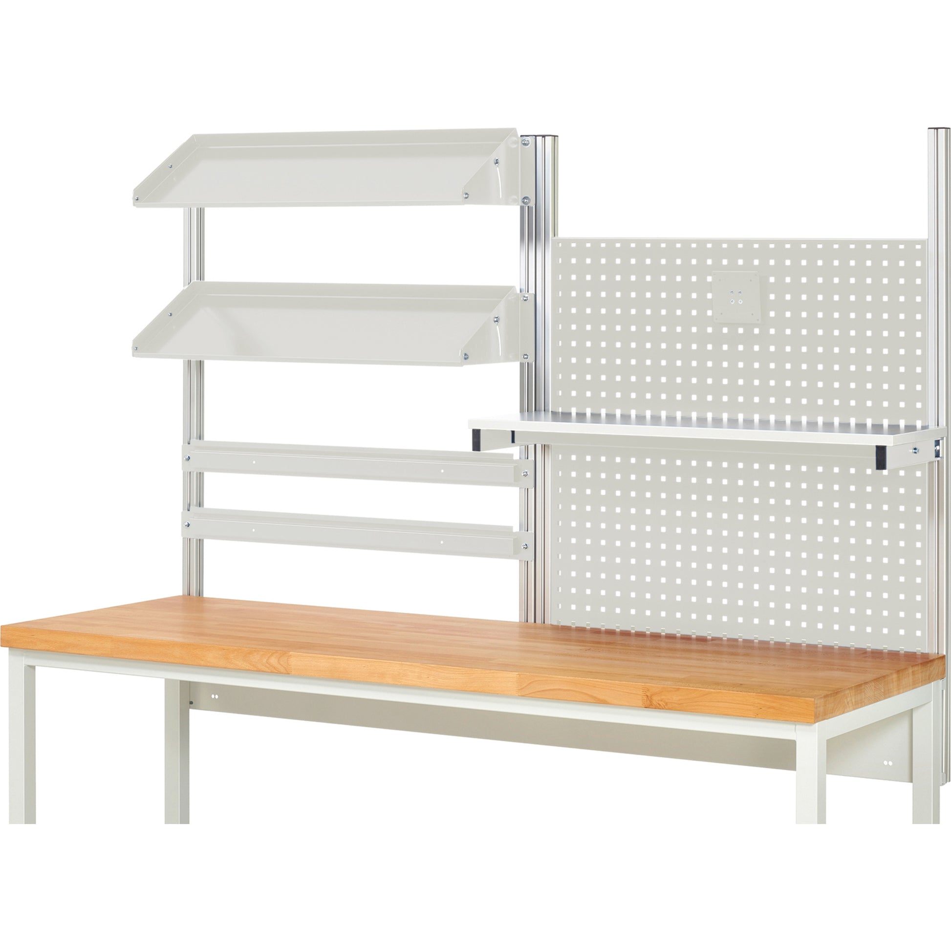 Set bestehend aus: 1 Befestigungssatz (Querträger) mit 4 System-Stützen, 2 Lochplatten (450 mm hoch) mit 4-Kant Systemlochung (Lochung 10 x 10 mm, Abstand Lochmitte-Lochmitte 38 mm) zur Aufnahme von Lochplatten-Zubehör. 1 Etagenbord, melaminbeschichtete (300 mm tief), 2 neigbare Metallablagen (300 mm tief) allseitige Aufkantungen. 2 Halteschienen für Aufnahme von Sichtlagerkästen (offene Einhängekante an der Rückseite der Sichtlagerkästen erforderlich) und/oder Energieleiste. 1 Flachbildschirmhalter mit Montageadapter für Lochplatte (VESA MIS-D 75/100). Einbauhöhe der Anbauelemente innerhalb der System-Stützen verstellbar. Der Befestigungssatz (Querträger) wird hinten unter der Arbeitsplatte an den Systemunterbau angebracht. Die 2 System-Stützen (Aluminiumprofil 40 x 40 mm) werden mittels Nutensteinen an den Befestigungssatz (Querträger) angeschraubt (Höhe einstellbar) und laufen hinter der Arbeitsplatte nach oben, so dass die gesamte Tiefe der Arbeitsplatte frei bleibt (kein Verschrauben auf der Arbeitsplatte). Die System-Stützen verfügen an allen 4 Seiten über eine Profilnut, so dass eine allseitige Nutzung möglich ist. Die 4 System-Stützen werden links und rechts außen sowie mittig angeschraubt, so dass 2 Systemfelder in der Systembreite entstehen.