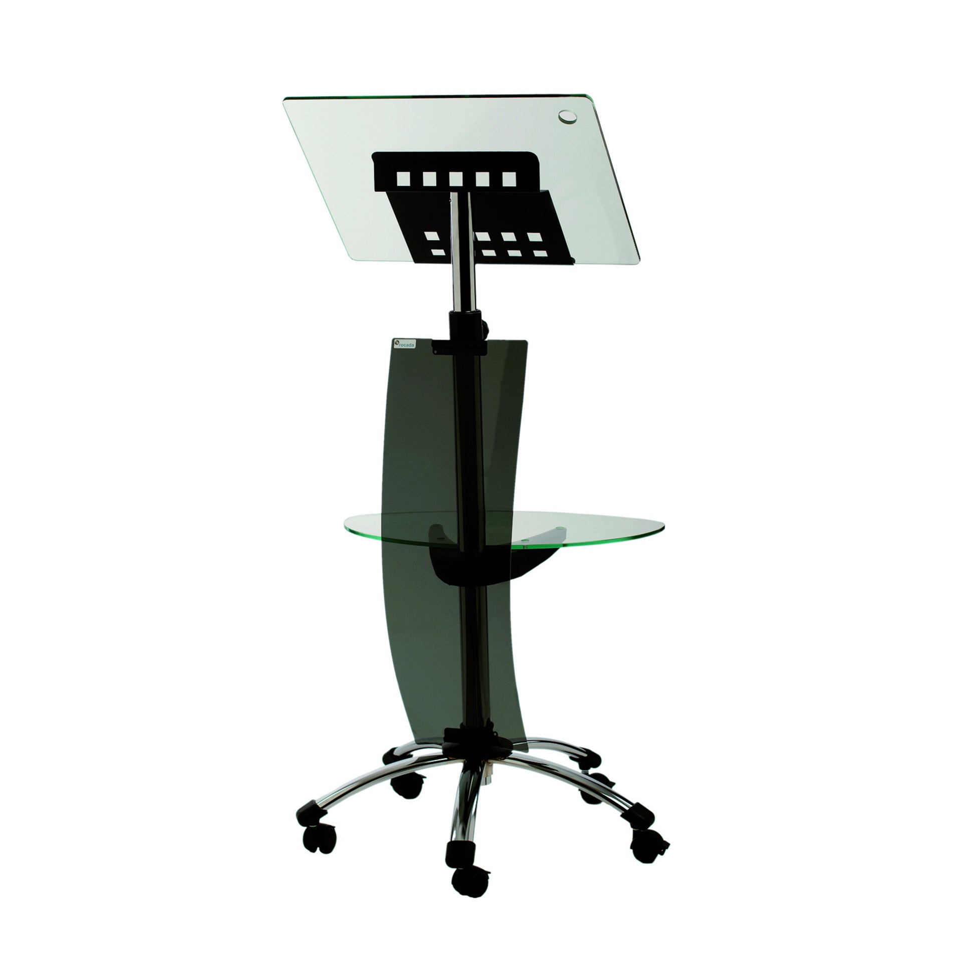 Elegantes, mobiles Rednerpult für Vorträge, Präsentationen, Ansprachen. Große Pultplatte und Ablage aus gehärtetem Glas, inklusive Aussparung als Mikrofon-Halterung. Elliptisch geformter Sichtschutz aus hochwertigem Acryl in transparentem Anthrazit. Höhenverstellung durch Federn, passt sich der Körpergröße an. Untere Ablage separat höhenverstellbar und drehbar. Hochwertige, feststellbare Rollen aus Polymer. Einfache Montage.