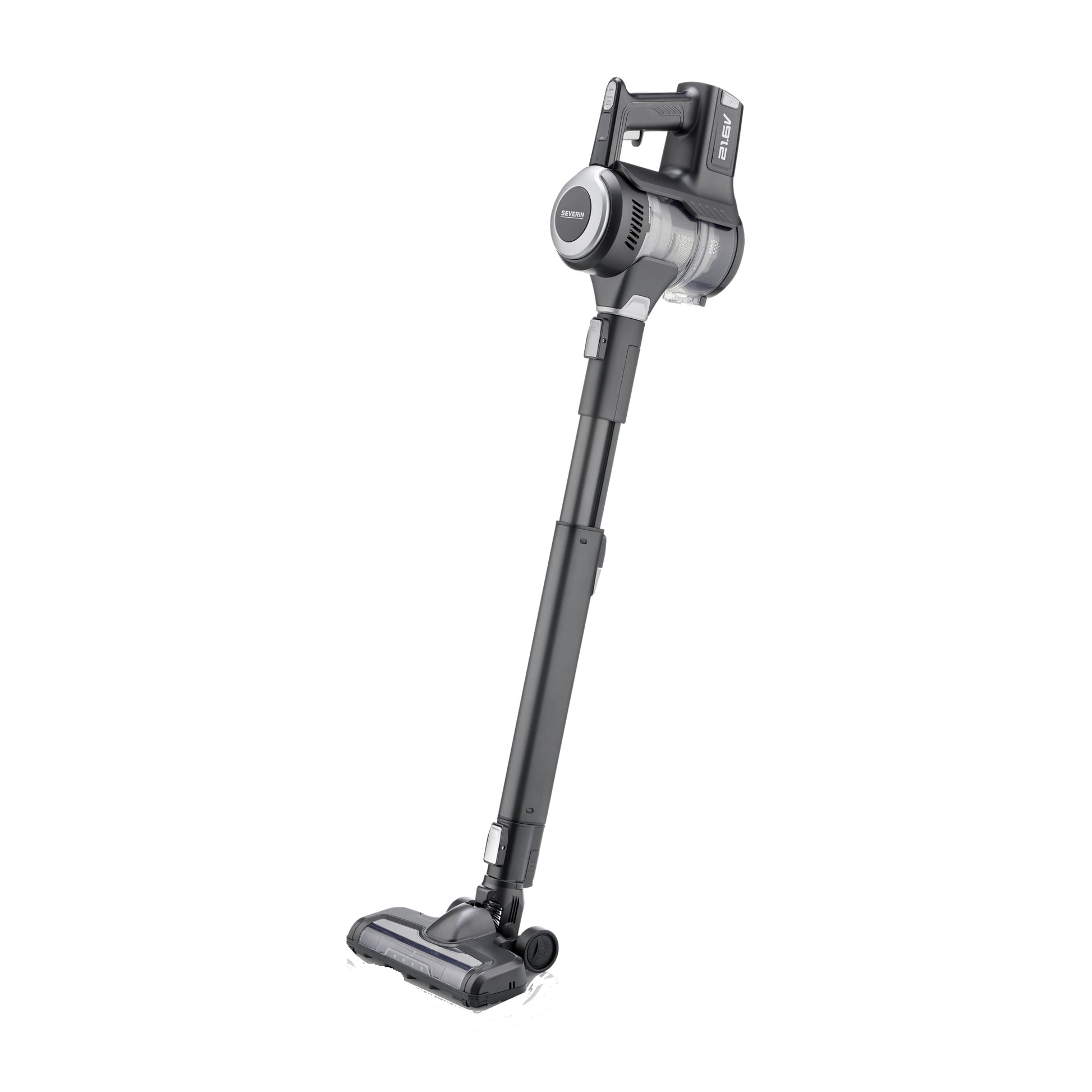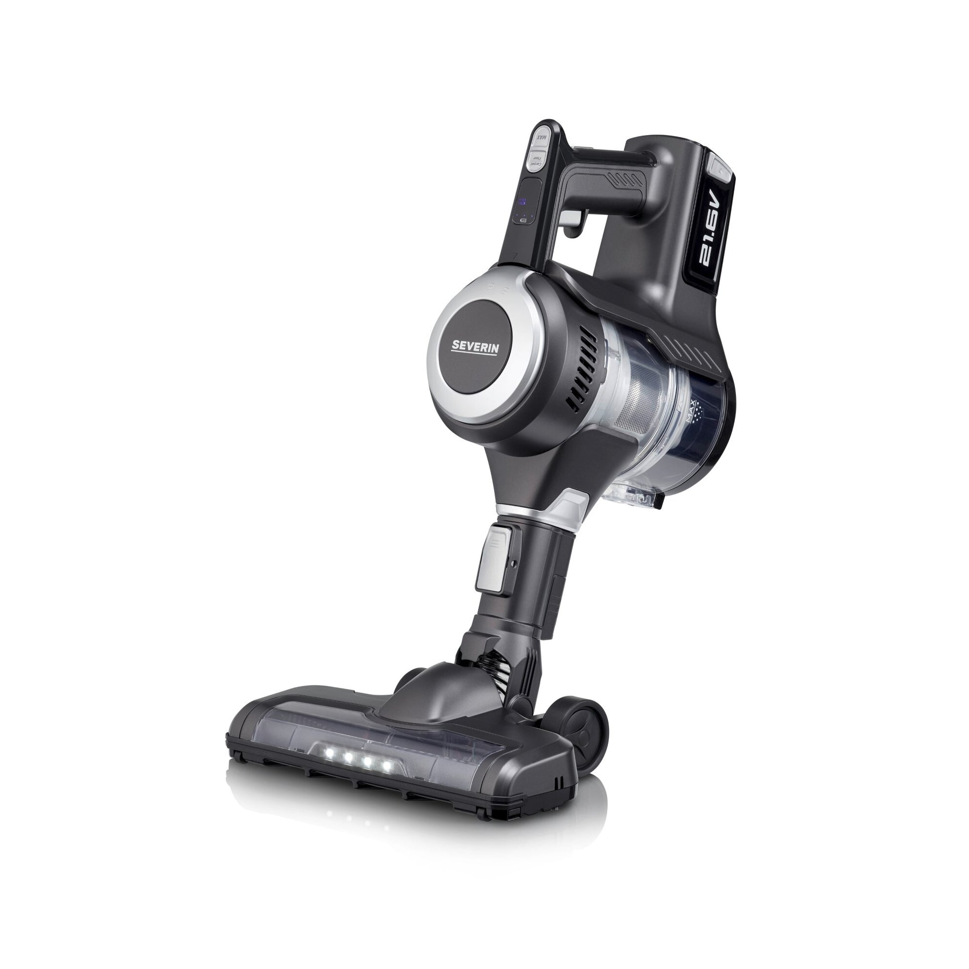 Bodendüse und Saugrohr bleiben in vertikaler Position, ohne sie zu verstauen. Smartes Display informiert über Laufzeit und Reinigungsmodus.