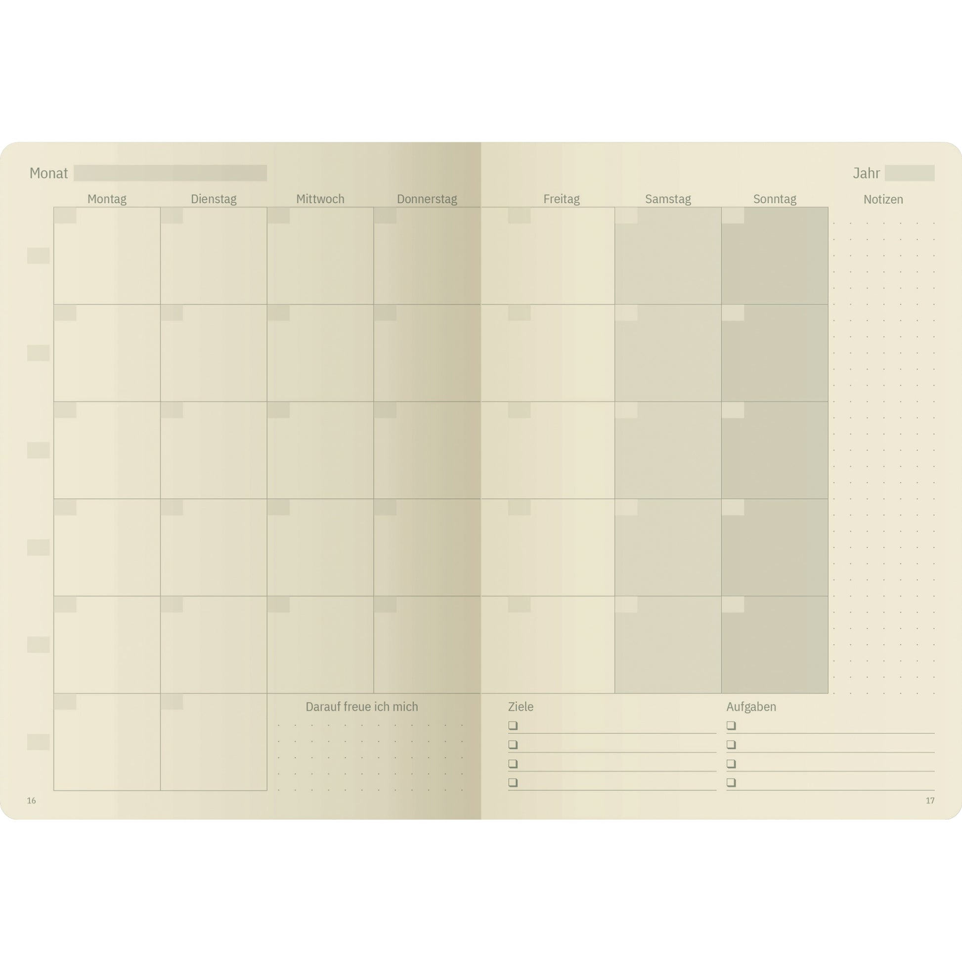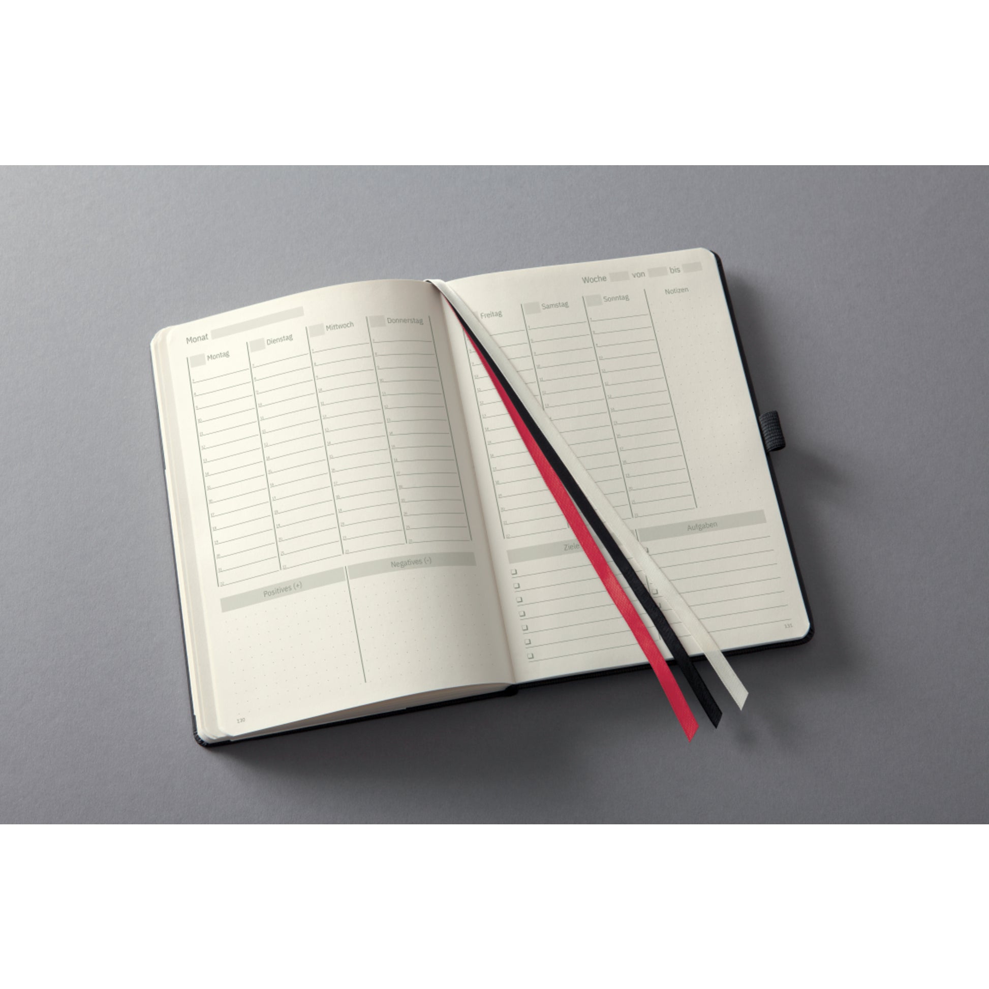 | Ausführung des Inhalts (bzgl. der Hauptausstattungsteile) | Stickerbogen, Inhaltsverzeichnis, Notizseiten (punktkariert), Monatsübersichten, Ziel- und Reflexionsseiten, Finanzplanung, Geburtstage |