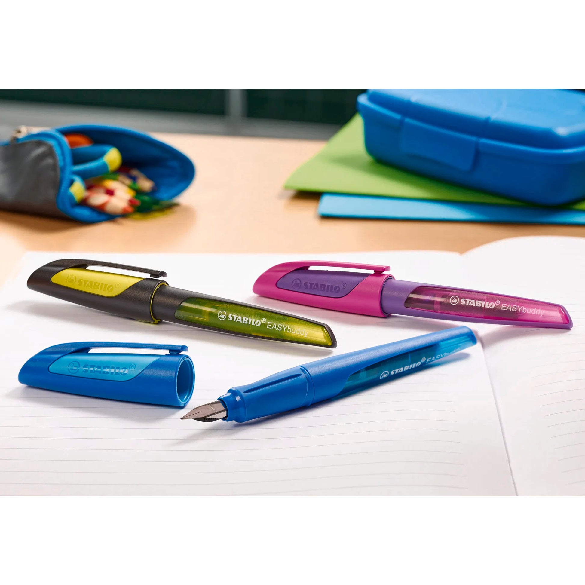 Der STABILO EASYbuddy ist der optimale Begleiter für kleine Helden und Heldinnen in der Grundschule. In ihm steckt das ganze Expertenwissen der STABILO Ergonomie-Profis, sodass ihren Kindern das Finden der richtigen Schreibtechnik einfacher fällt und sie jede Menge Spaß am Schreiben haben. Die universelle, rutschfeste Soft-Griffzone des ergonomischen Schulfüllers sorgt für sicheren Halt, was ein entspannte Stifthaltung fördert und einem frühzeitigen Ermüden der Muskulatur vorbeugt. Eine für den STABILO EASYbuddy speziell entwickelte Technologie minimiert zudem das Risiko des Auslaufens der Tinte. Nachfüllbar ist der Füller mit zwei Standardpatronen oder einer Großraumpatrone. Das extra große Sichtfenster sorgt für die leichte Kontrolle des Tintenstandes bei beiden Patronen.