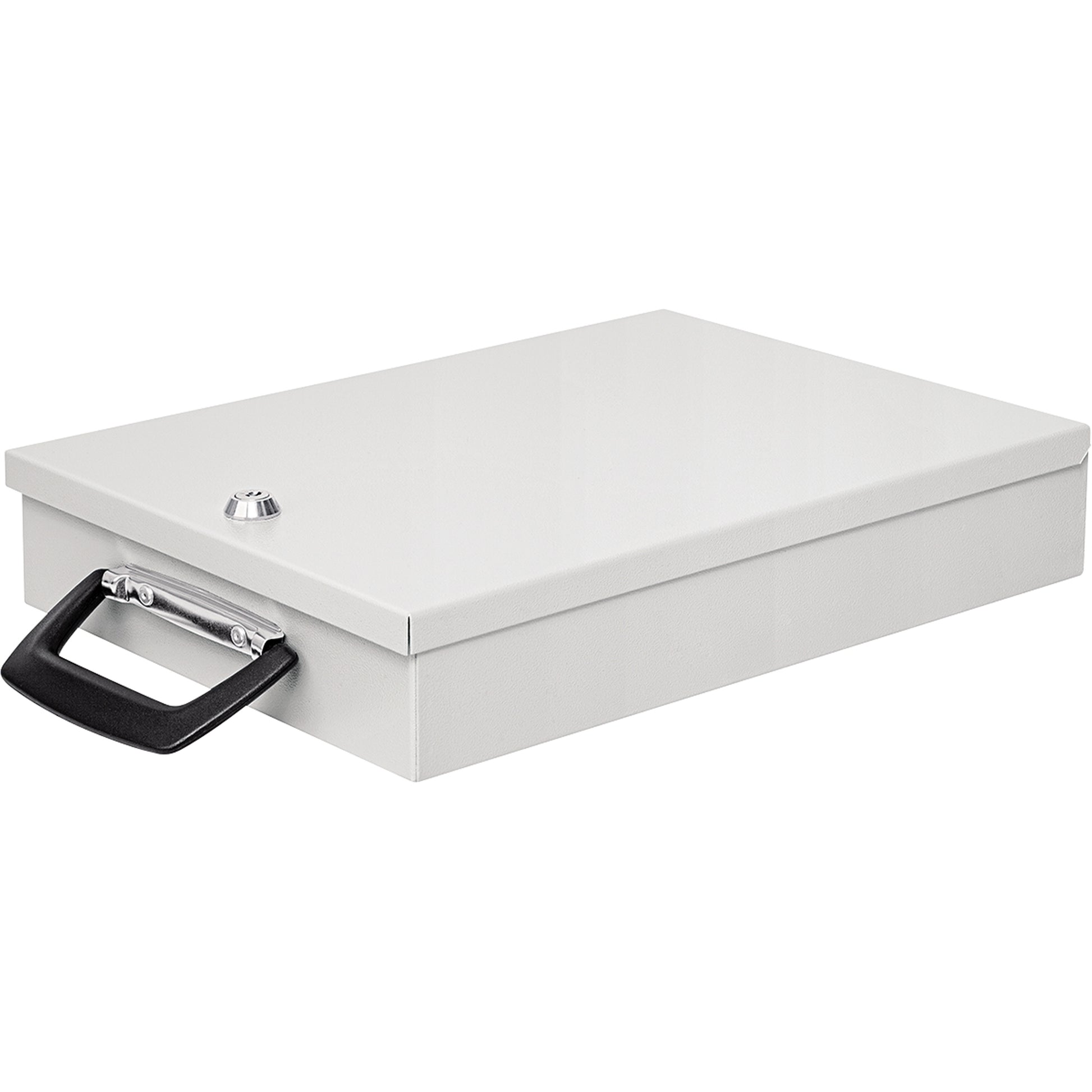 Dokumentenkassette mit mattierter, unempfindlicher Oberfläche zur Aufbewahrung wichtiger Unterlagen und Verträge. Zwei Bohrlöcher im Boden erlaufen eine Schraubbefestigung in der Schublade.