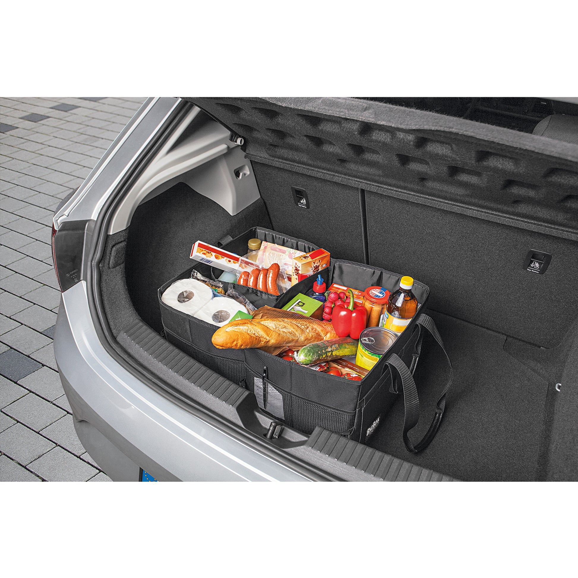 Die Einkaufstasche mit Pfiff. Verwandelt sich im Handumdrehen in eine Kofferraumbox! Passt in jeden Einkaufswagen. Mit Klettbefestigung für den Kofferraum. Bequem zu tragen durch zwei lange und zwei kurze verstärkte Tragegriffe. Zur Aufbewahrung flach zusammenfaltbar.