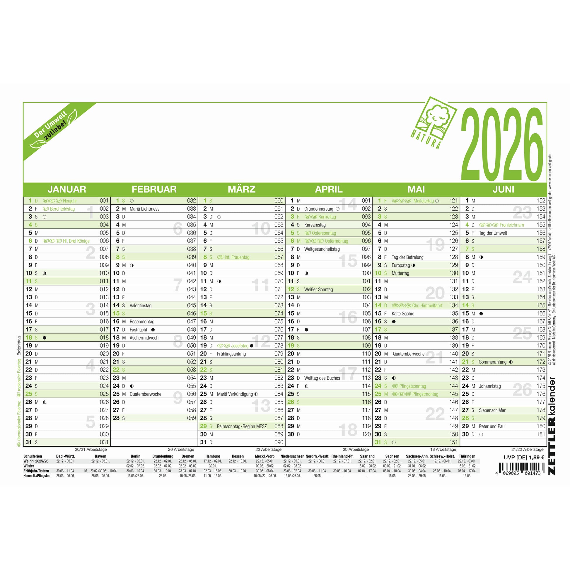 Zettler Arbeitstagekalender A4 quer 6M/1S